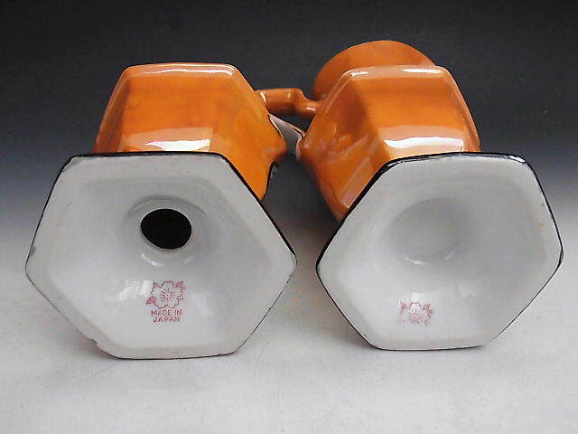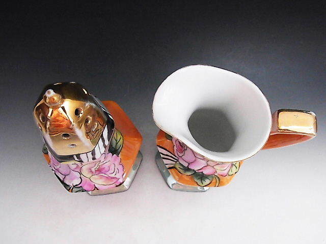 アールデコらしいストリームラインに薄紅色の薔薇を描いたオールドノリタケのマフィナー作品です。 台座部分は六角形で二色のラスター彩に塗り分けられています。 マフィナーとはパンケーキやマフィンなどに振りかける粉砂糖とシロップなどの容器になりますが、最近では見ることないものです。  状態は金彩に少々色の擦れがある以外ほぼ完全美品です。 底の穴はコルク栓で蓋すようになっていますがコルクはございません。 裏印は通称サクラ印で、年代は大正後期の米国向け作品です。 大きさはマフィナーの全高が18㎝、シロップジャーの高さが15㎝、底部の対角直径が6.5㎝ あります。 送料は2800円頂きます。 支払いはYahoo!かんたん決済、または銀行振込みでお願いします。 日本以外への海外発送も承ります。 ご入金確認後支払2日以内にアメリカより航空便でお送りいたします。 発送後通常4~10日でお届けいたします。 複数品落札の場合は送料をまとめて計算させて頂きますのでお得になります。 私共は経済産業省の定める特定商取引法を順守しております。 当方の所在地住所等は出品者の自己紹介情報欄をご覧ください。 ご質問等ございましたらお気軽にお問い合わせください。   他にもオールドノリタケを中心に沢山出品しておりますのでここをクリックしてご覧ください。