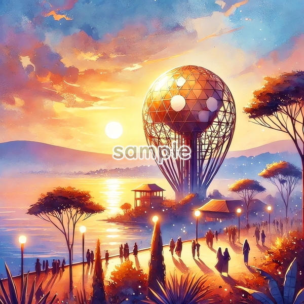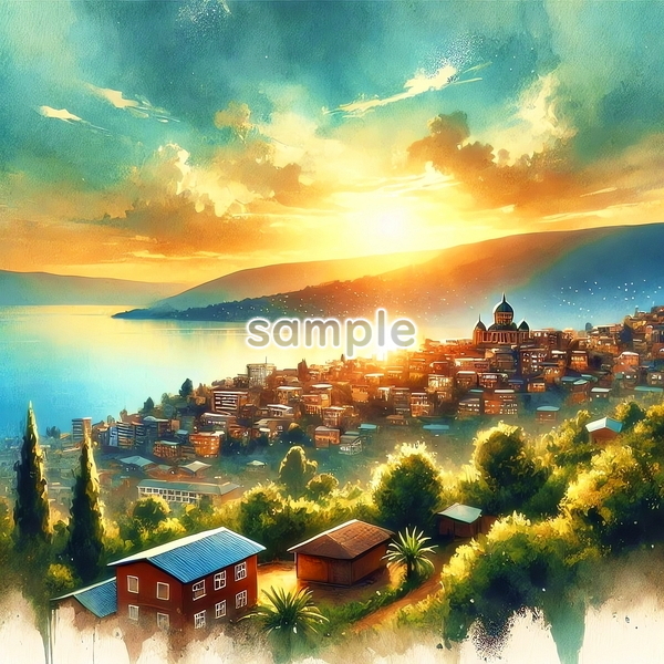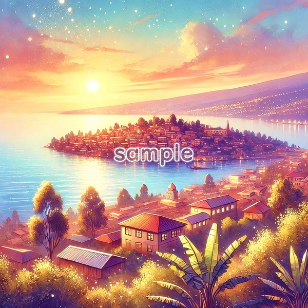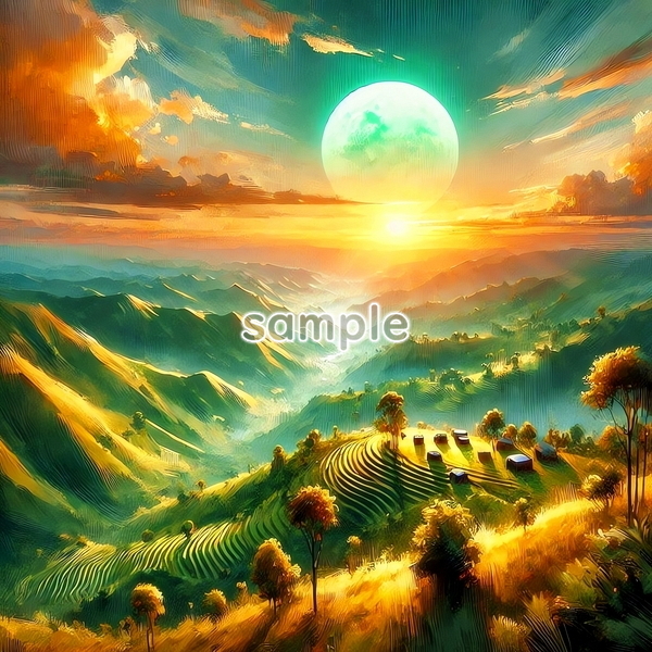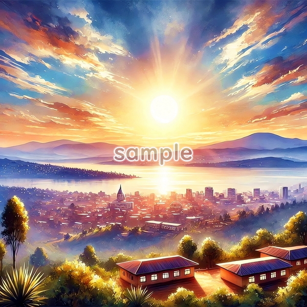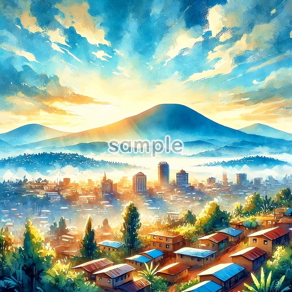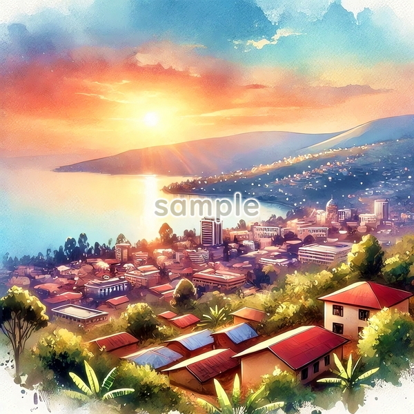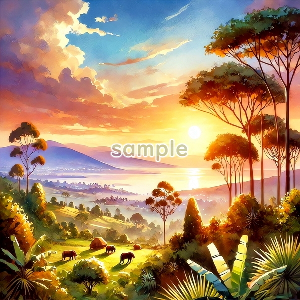 | ブルンジ 世界国景色 緑と夕日と光 水彩 オリジナル絵イラスト 164P Burundi World country scenery green sunset light watercolor Original painting art picture image material |