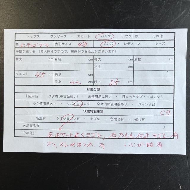 ・シミやヨゴレ有(左ポケット近くヨゴレ、右太もも付近ヨゴレ有)