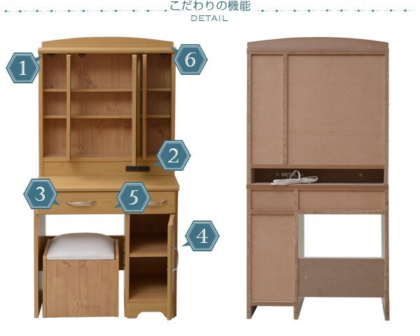 | 商品説明 | スタンダードなカラーでシンプルな三面鏡ドレッサー。お得なセットのスツールは座面の中に収納可能なスペース付。広めの引出しと、小さめの引出し、背の高いものも収納できるガラス扉収納スペースもあり、ミラーの裏側にも収納できるので、メイクアップに必要なものを大量収納できます。2口コンセント付きなので、ドライヤーやヘアアイロンもドレッサー周りでご使用いただけます。 |