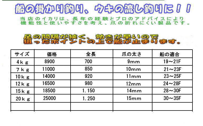 | 商品の説明 | このタイプのアンカーは岩礁では良く効きますが、最大の弱点は溶接の付け根で折れやすい、溶接で焼きが入りもろくなってます。このアンカーは溶接の付け根を補う、補強リングを入れてますので今までのアンカーより持ちが良いです。 ご希望により各サイズ製作致します、IDをお持ちで無い方や、 詳しいことはこちらのメールよりお問い合わせください。 オークション落札価格は4kgの価格です、後ほどご希望重量の詳細をお伝えさせていただきます、お間違いの無いようご注意ください。 |