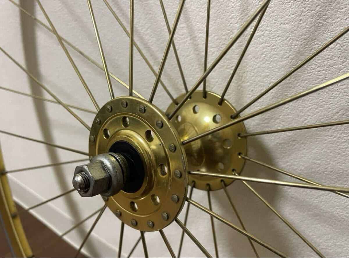 UAゴールドのホイール、穴あきデザインのハブ付き。