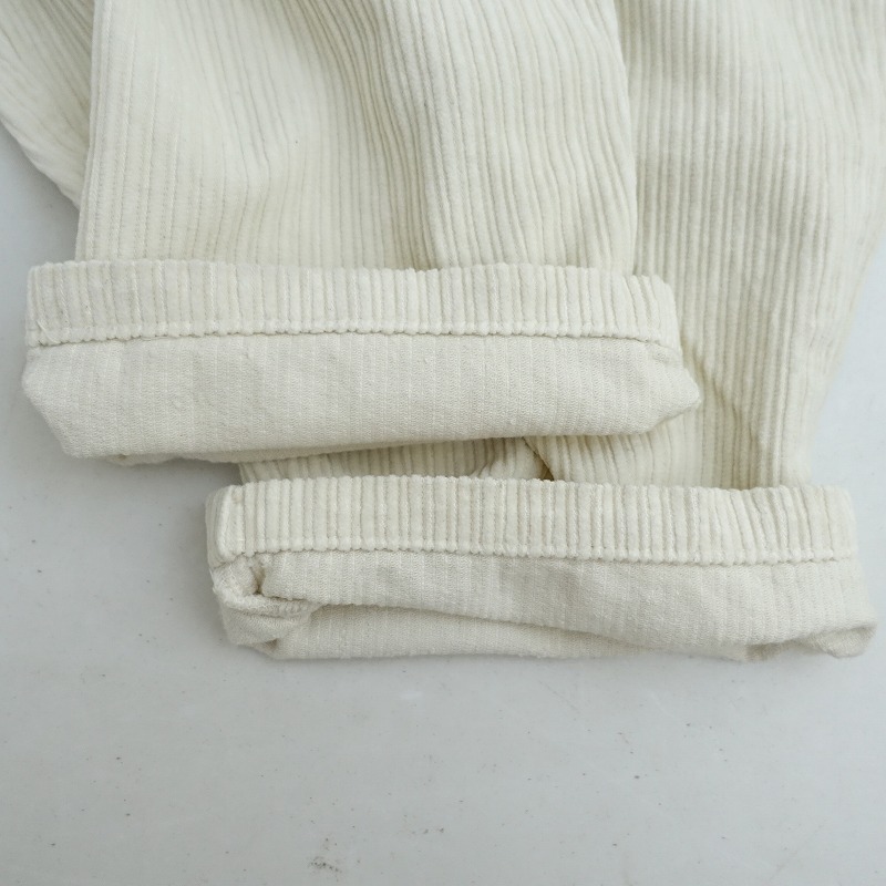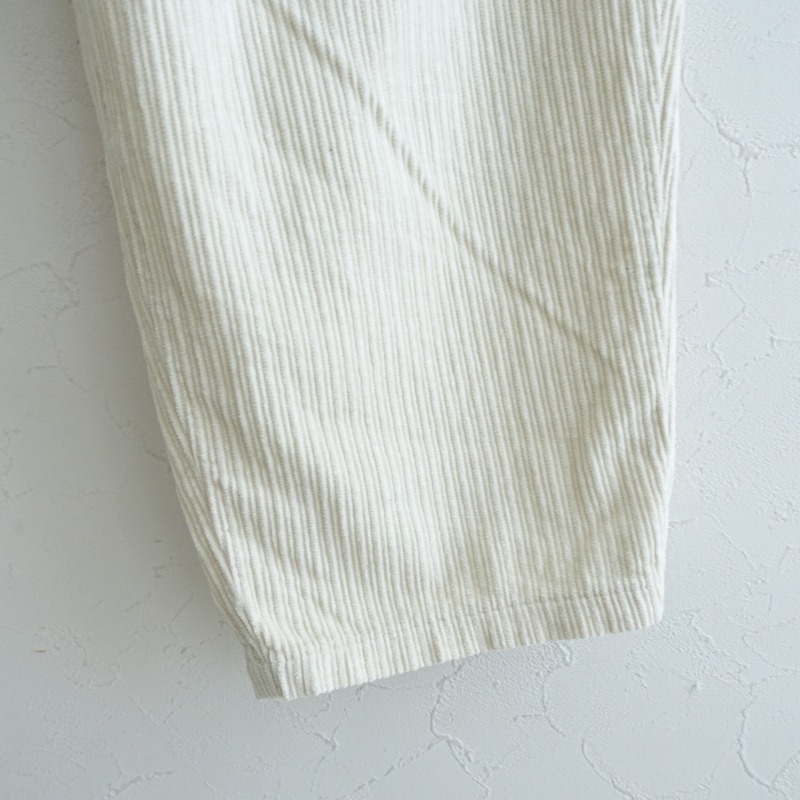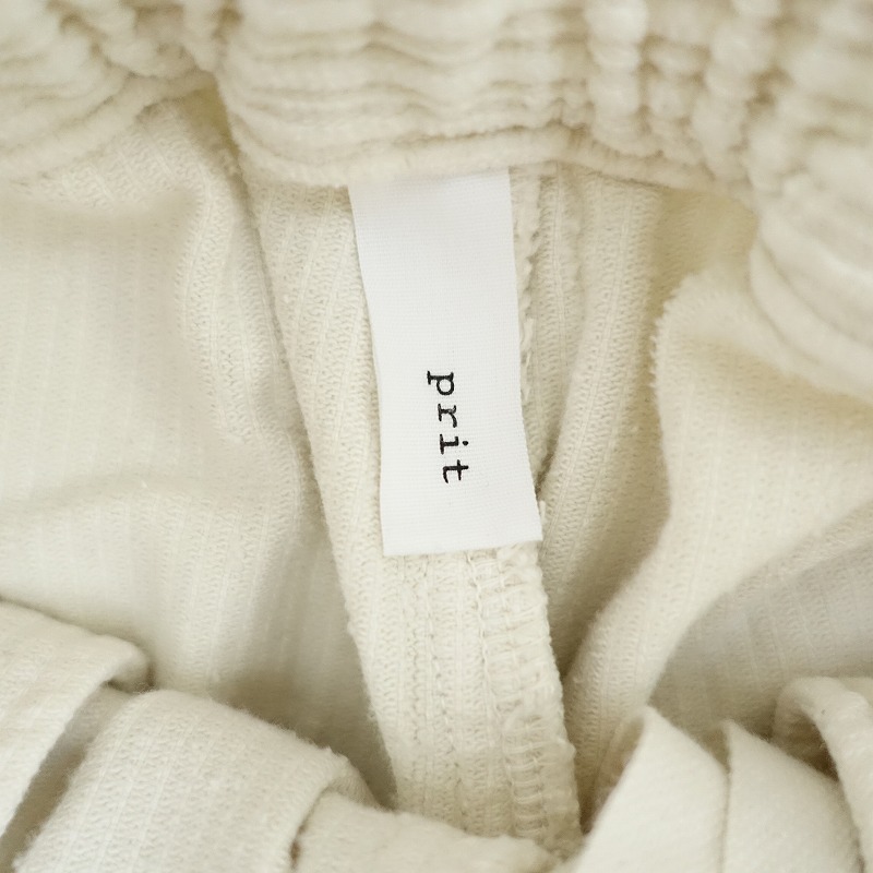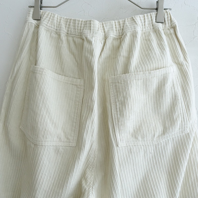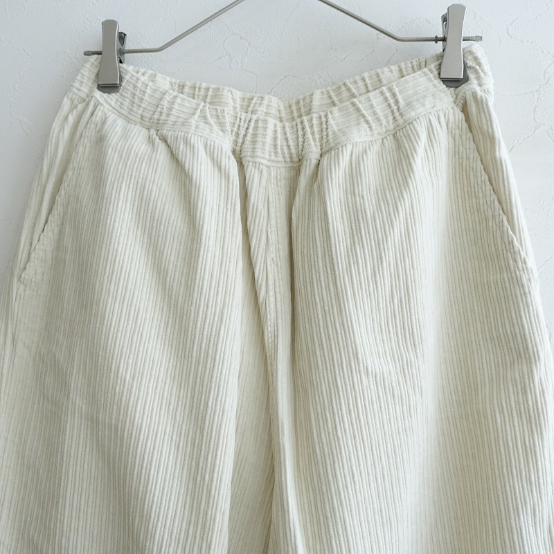| pritのコットンコーデュロイイージーパンツです。カラーはオフホワイトで、畝の異なるコーデュロイ地で仕立てられております。ウエストはゴム&ひも入り、ポケットは4つ付いております。 |