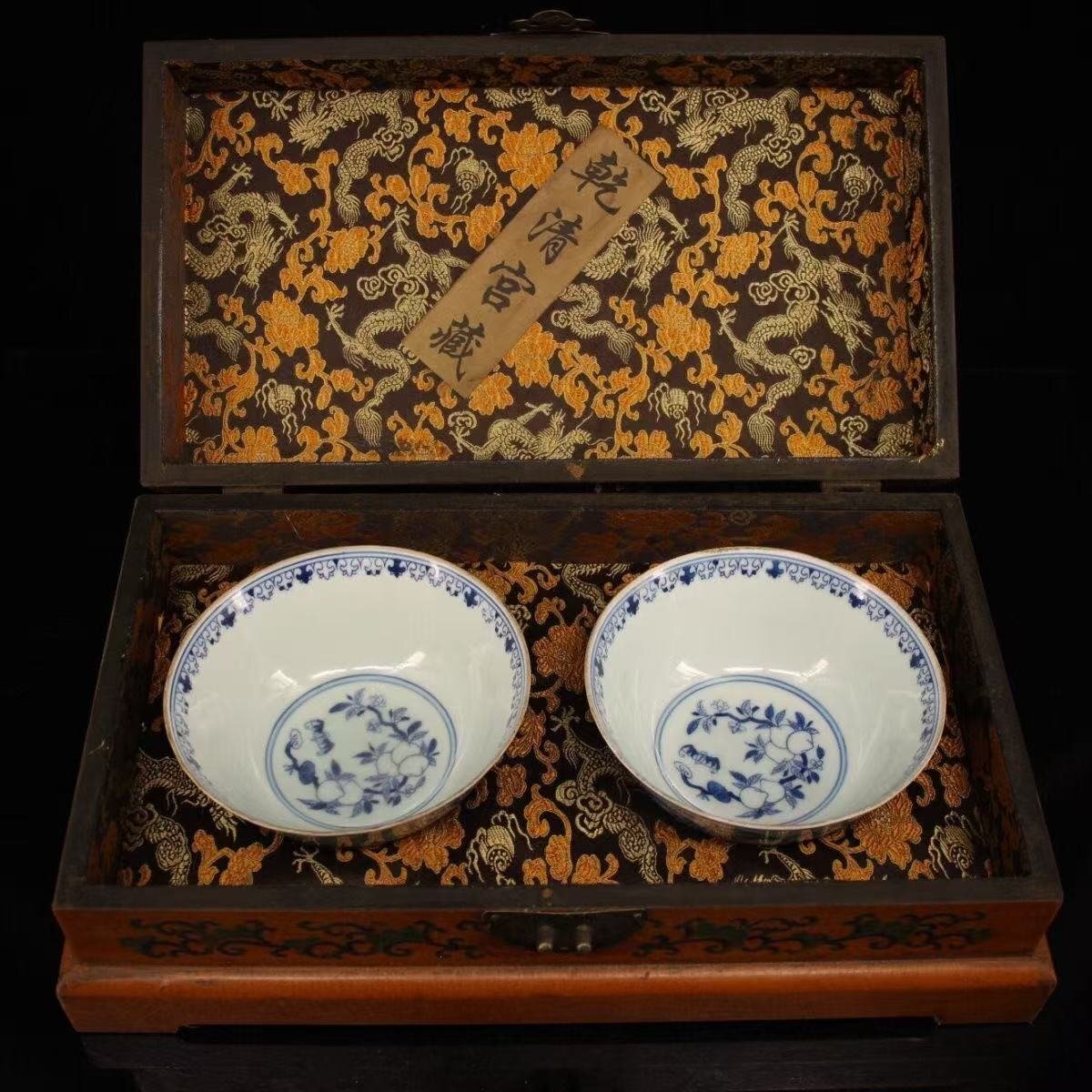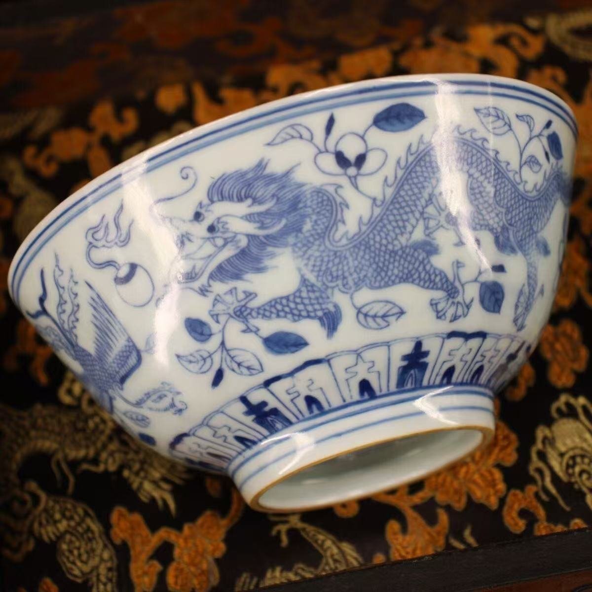 J968 旧家収蔵 【純手工絵画青花龍鳳磁器碗一対】 箱はランダム 置物