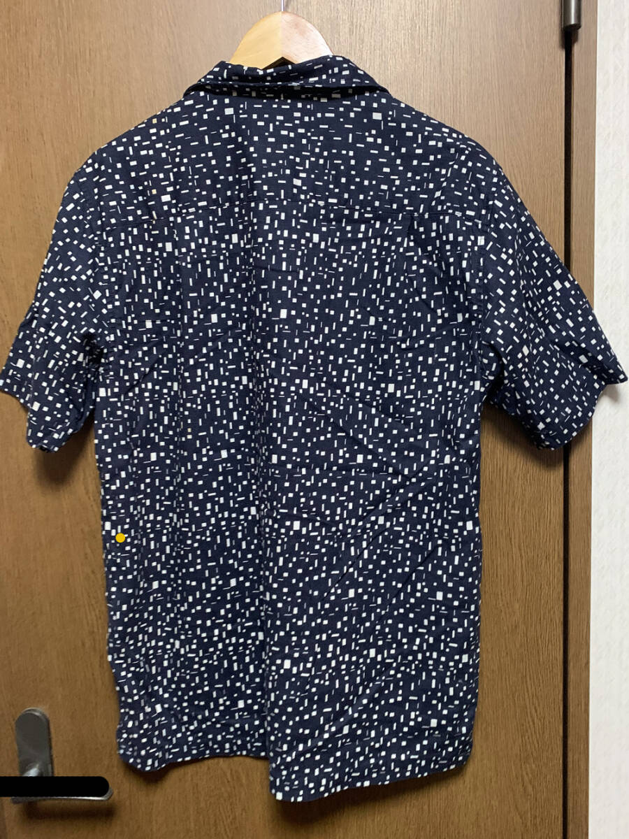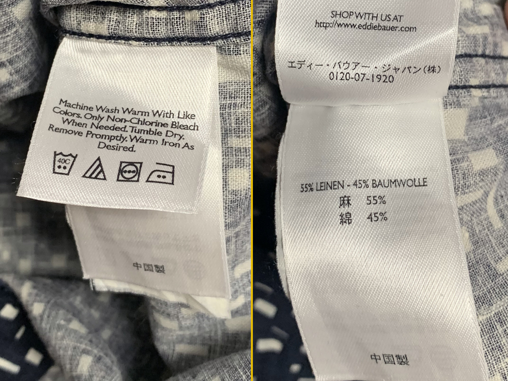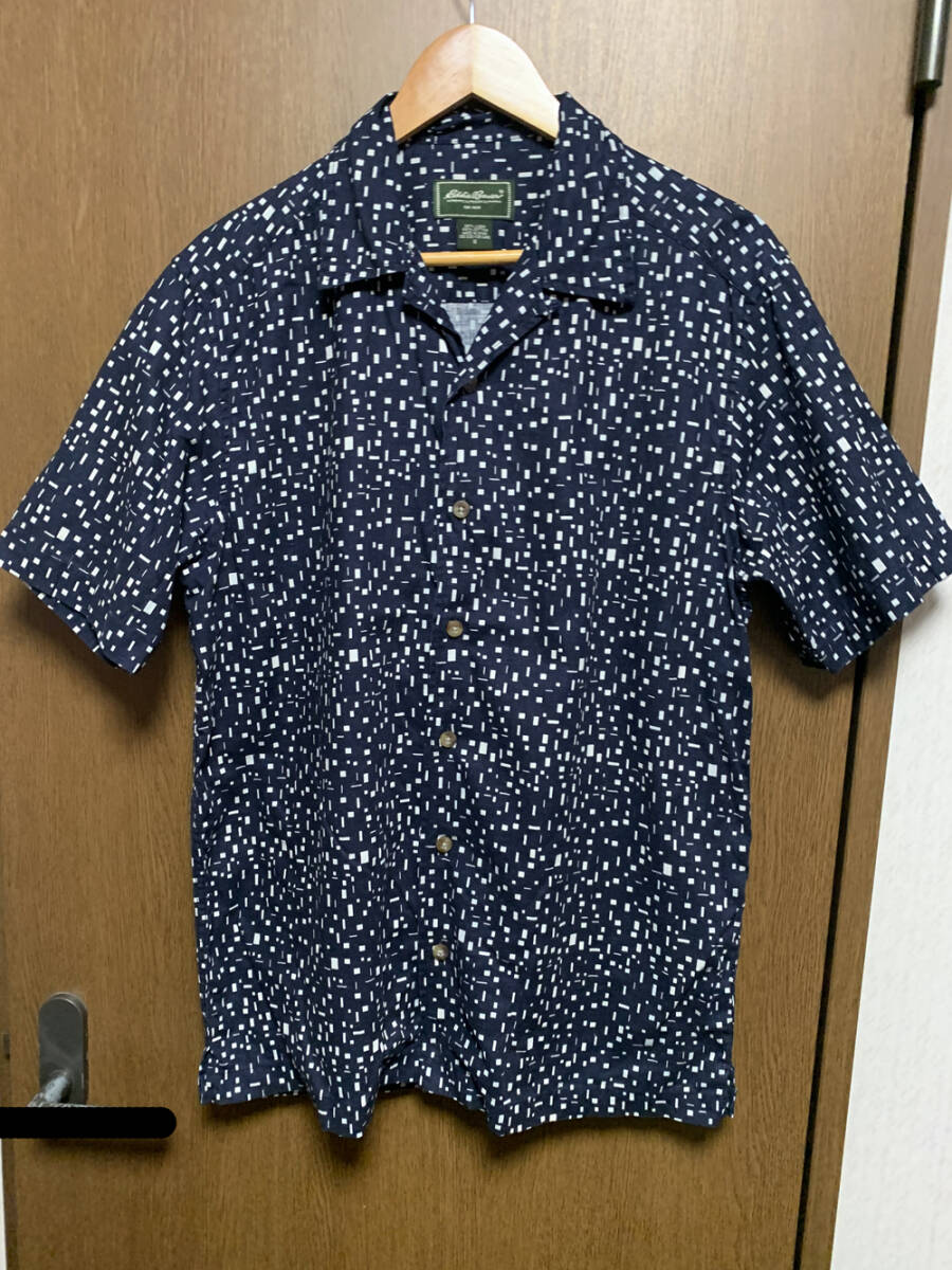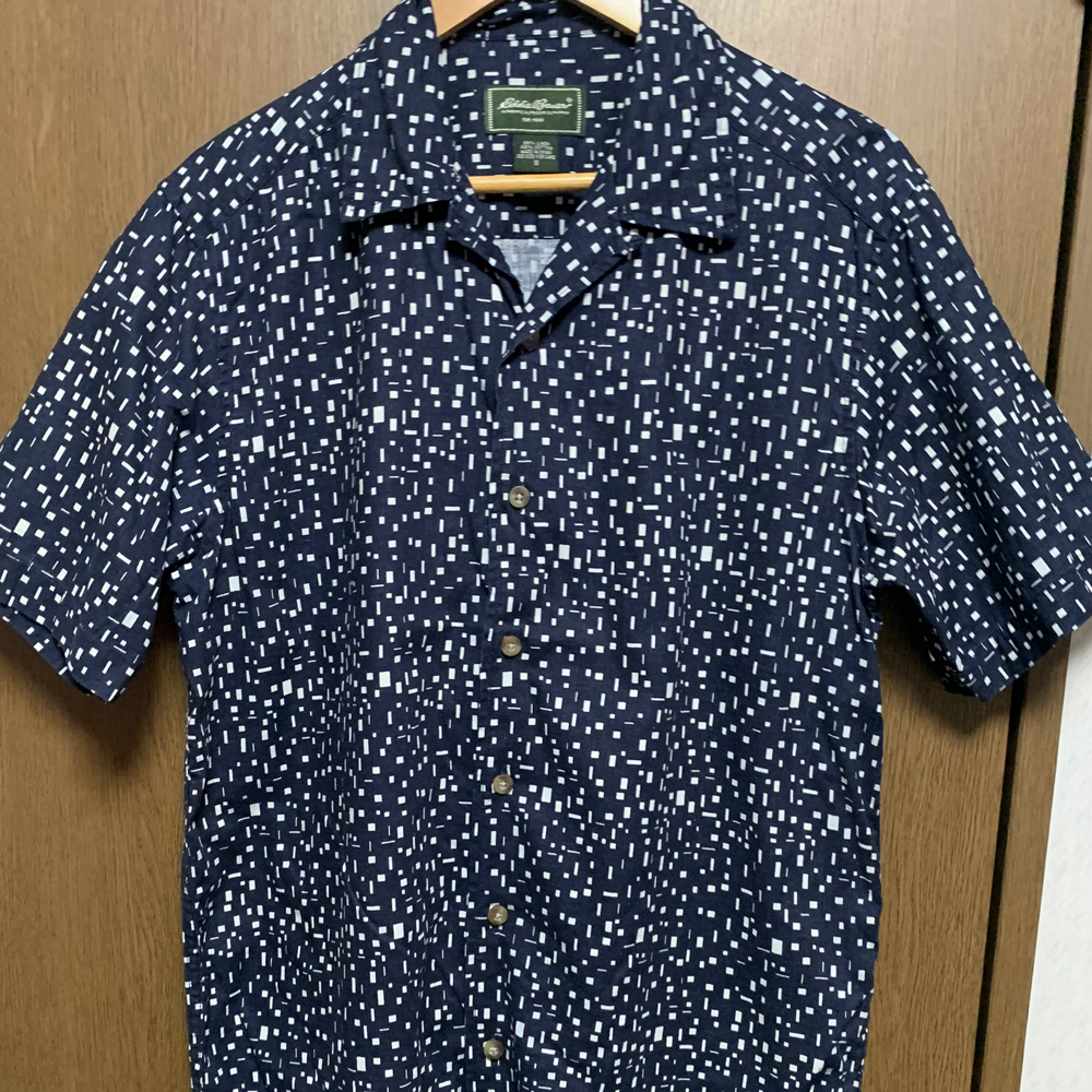 S【Eddie Bauer|半袖シャツ】エディーバウアー ネイビー 総柄 麻リネン55% オープンカラー 開襟シャツ