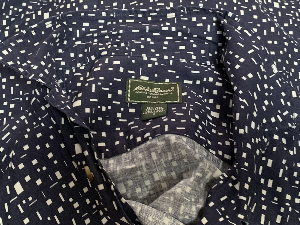 S【Eddie Bauer|半袖シャツ】エディーバウアー ネイビー 総柄 麻リネン55% オープンカラー 開襟シャツ M~L位も