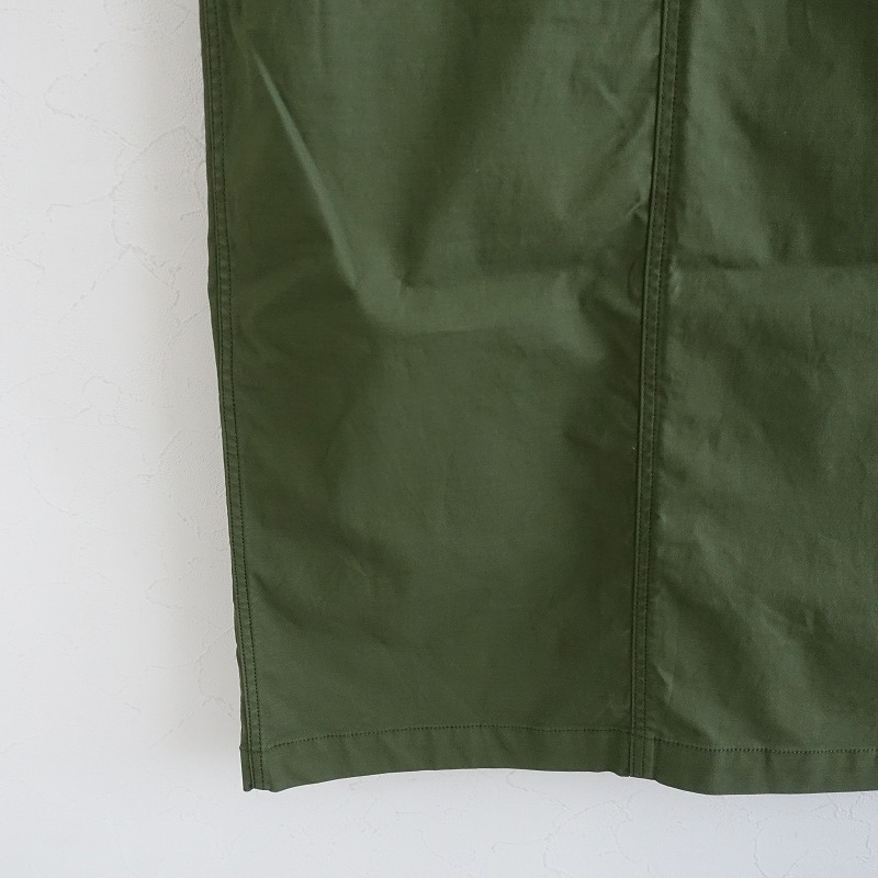 | 2025年春夏コレクション JOURNAL STANDARD relumeのベイカースカートです。カラーはグリーンカーキ(ブランド表記カラーはカーキ)で、ストレッチ素材です。フロントのボタン&ジッパーで着脱でき、後ろウエスト両サイドにタブボタン付きで、バックセンターベント入りです。前腰左右&ヒップ左右にポケットがあり、裏地は付いておりません。 |