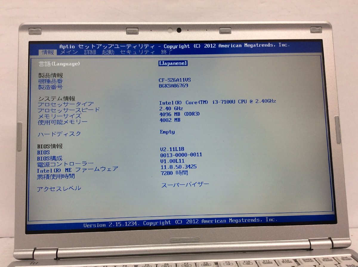 ジャンク/ Panasonic CF-SZ6A11VS Intel Core i3-7100U メモリ4.1GB ストレージ無し 【K19428】