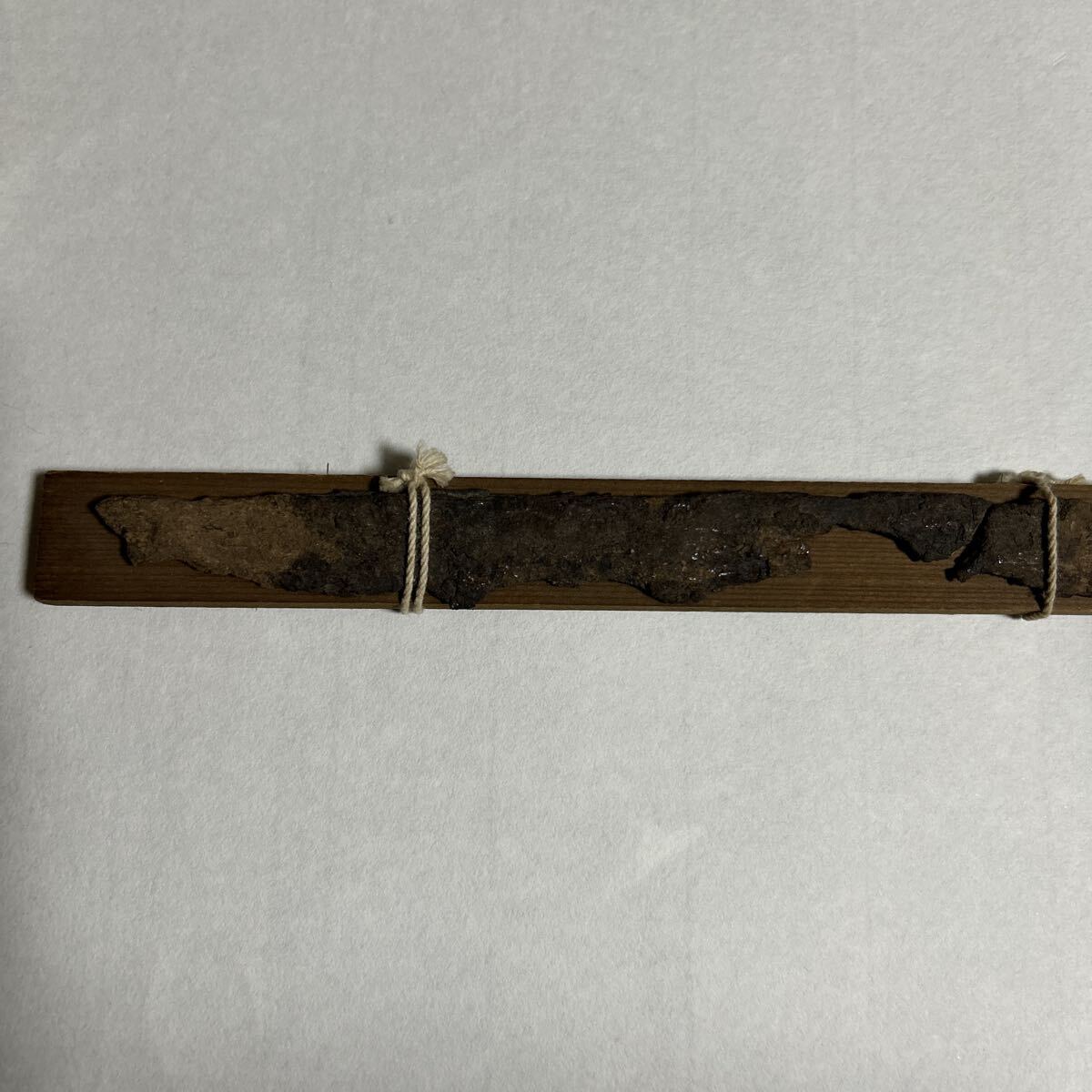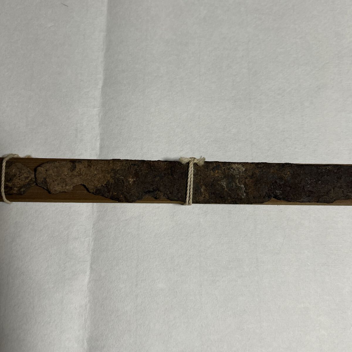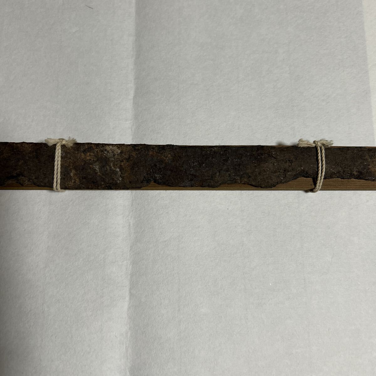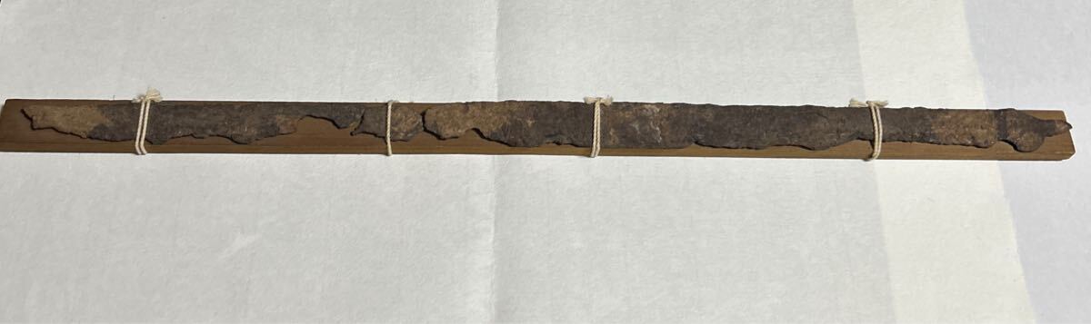 古墳時代の上古刀です。木製の台に紐で固定されています。中程で折れており、3つの破片に分かれています。