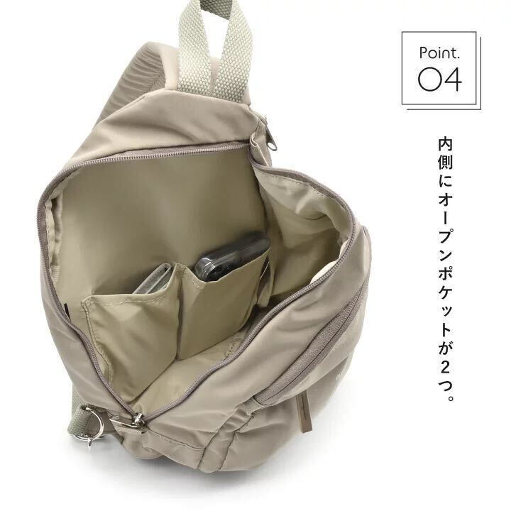 スタッフコメントしっとり肌触りの良い、ナチュラルな質感が人気のモイストシリーズからボディバッグが登場!ネームや引手にベージュカラーを取り入れ、自然で優しい雰囲気に。
