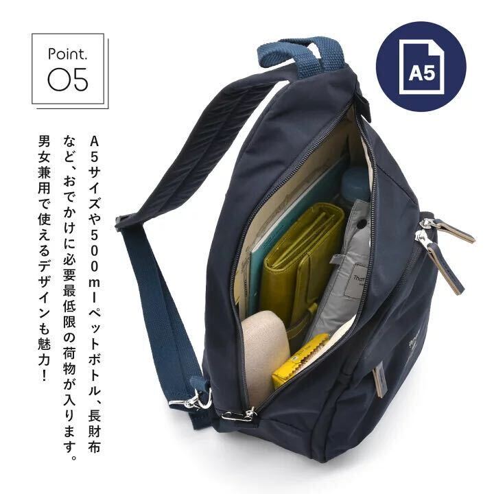 フロントのファスナーポケットはマチ付きなので、しっかり開き出し入れしやすく、中身もこぼれにくくなっています。内ポケットはメッシュなので中身も一目瞭然!背面にはファスナーポケットと、中身が直接取り出せる直結ファスナーが付いています。ショルダーベルトはどちらの肩にも背負える仕様になっています。A5サイズや500mlペットボトル、長財布など、おでかけに必要最低限の荷物が入ります。男女兼用で使えるデザインも魅力!