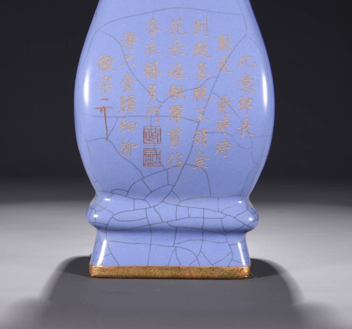 宋時代 古陶磁器 官窯 包口 金口金足 詩詞賦 方瓶 花瓶 賞瓶 磁器 文案置物 擺件 時代物 古董品 骨董 旧家蔵出し 唐物 中国古玩 古美術