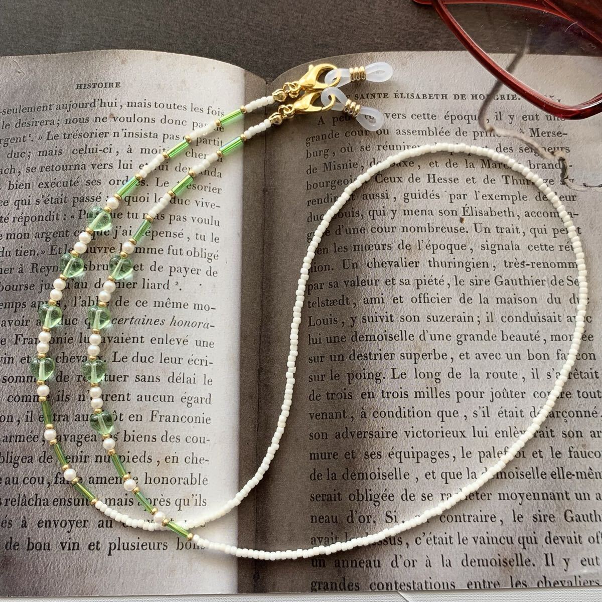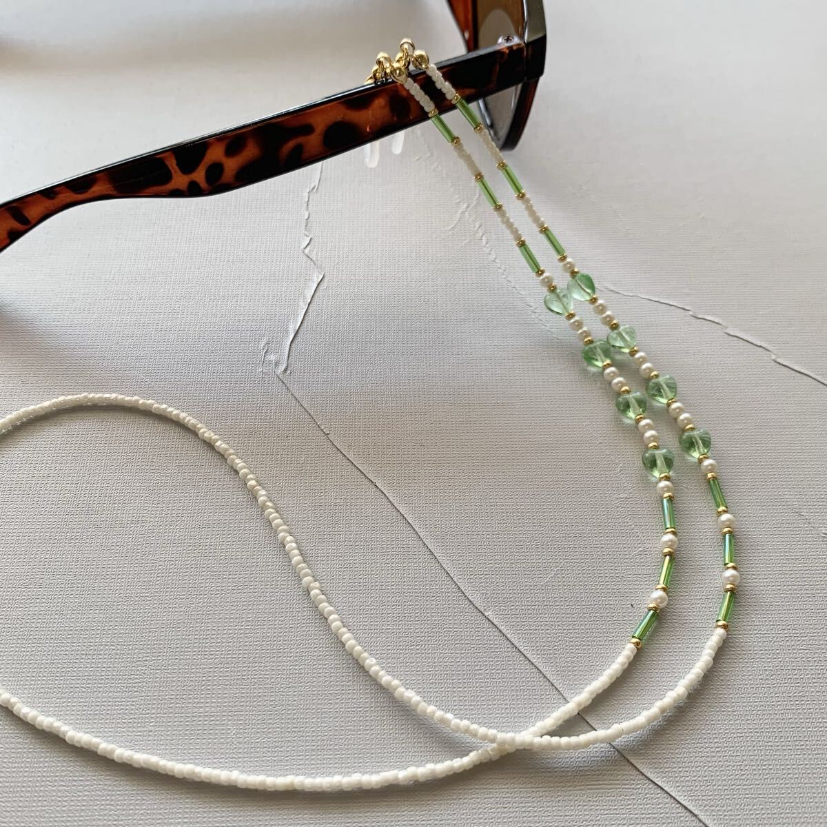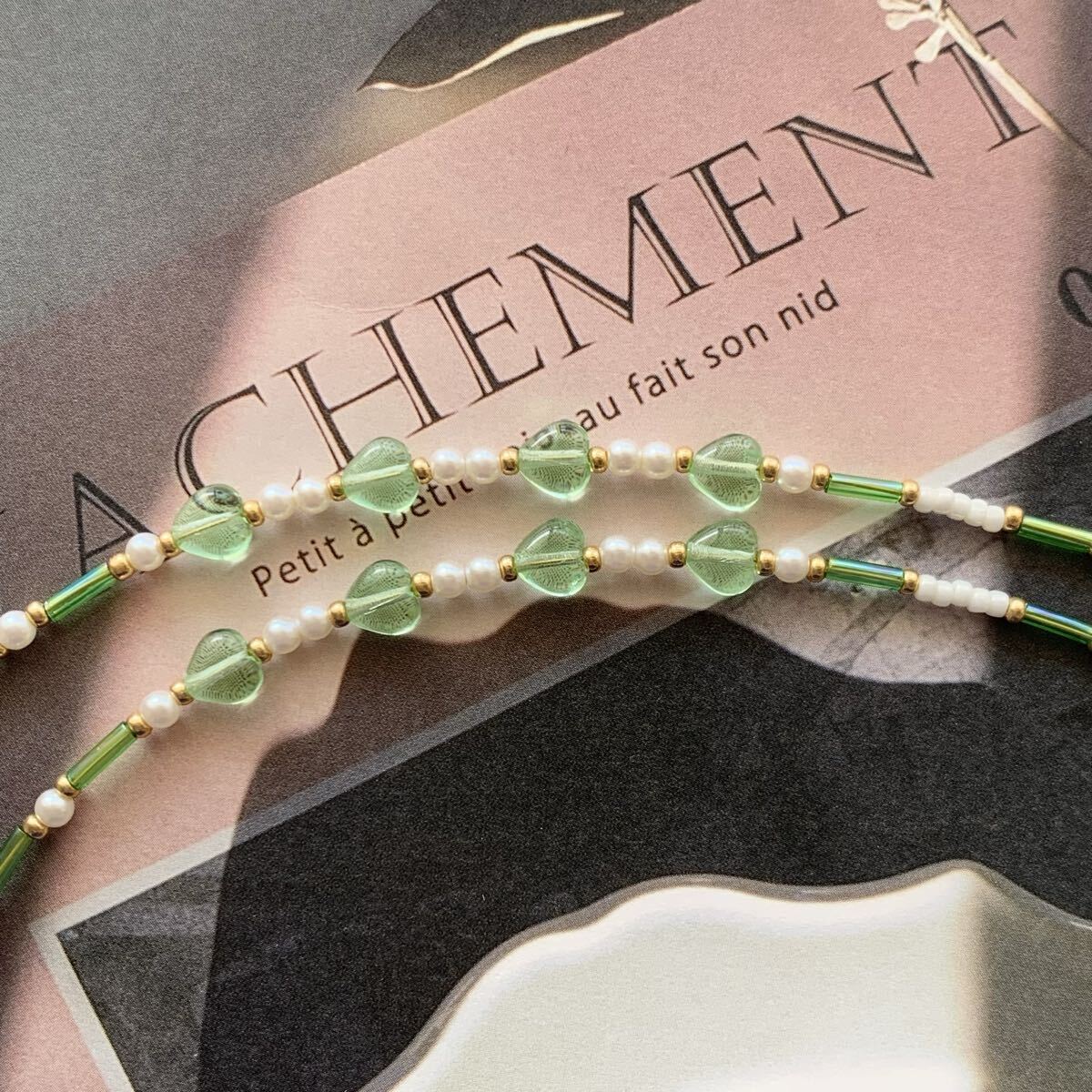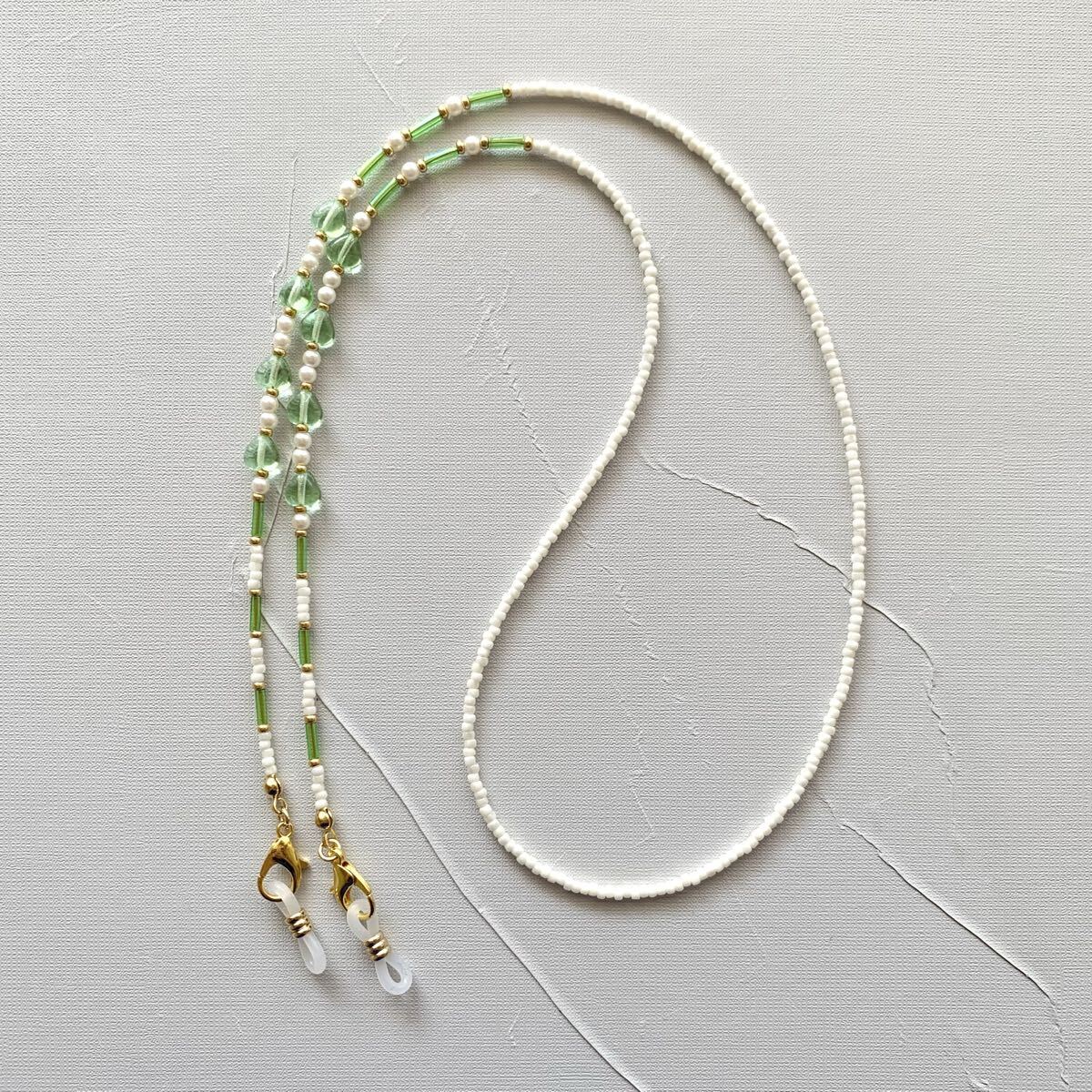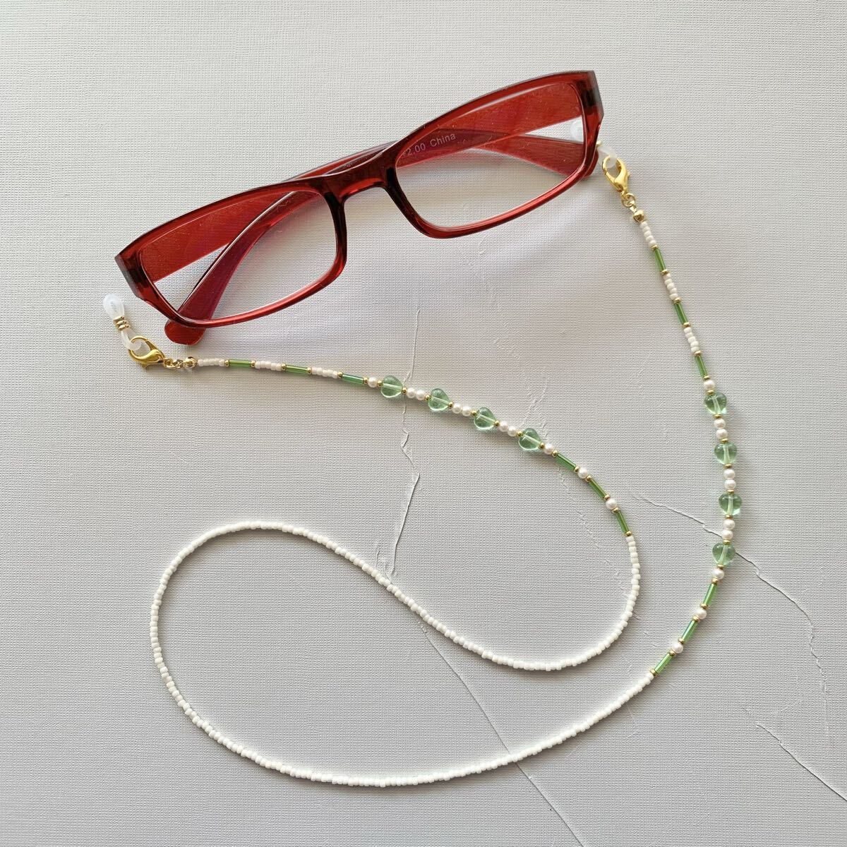 キュートなハートのチェコビーズと同系色の竹ビーズを組み合わせた、フェミニンなメガネチェーンです。ランダムにカットが施されたシードビーズが、キラリと輝き、顔周りを明るく華やかに。ふっくらとした愛らしいハートもアクセントになり、いつものメガネスタイルを一層おしゃれに引き立ててくれます。メガネ留めは取り外し可能。耳元のおしゃれが楽しめない時でも、マスクチェーンとしてさりげない華やかさをプラスしてくれます。メガネを外したときも首からかけておけるので、置き場所に困ることもありません。大切な方へのプレゼントにもおすすめ◎日常にさりげない輝きと愛らしさを添えてくれる、特別な一本をどうぞ。