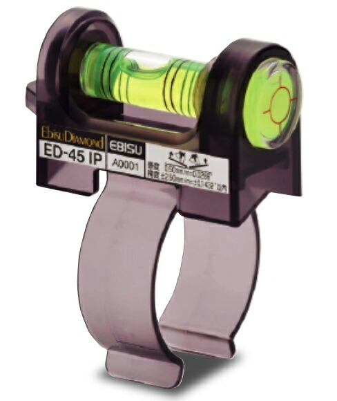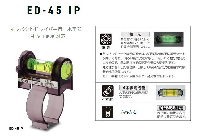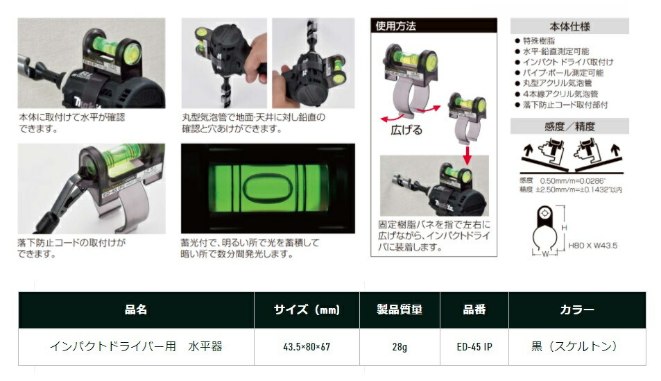 エビス EBISUインパクトドライバー用 水平器ED-45IP■製品の特徴・本体に取付けて水平が確認できます。・落下防止コードの取付けができます。・丸製気泡管で地面・天井に対し鉛直の確認と穴あけができます。・蓄光付で、明るい所で光を蓄積して暗い所で数分間発行します。■本体仕様●サイズ:43.5×80×67mm●製品重量:28g●カラー:黒(スケルトン)●感度:0.50mm/m=0.0286度●精度:±2.50mm/m=±0.1432度以内●材質:特殊樹脂●水平・垂直方向360度測定可能●パイプ・ポール測定可能●丸形アクリル気泡管●4本線アクリル気泡管●落下防止コード取付部付