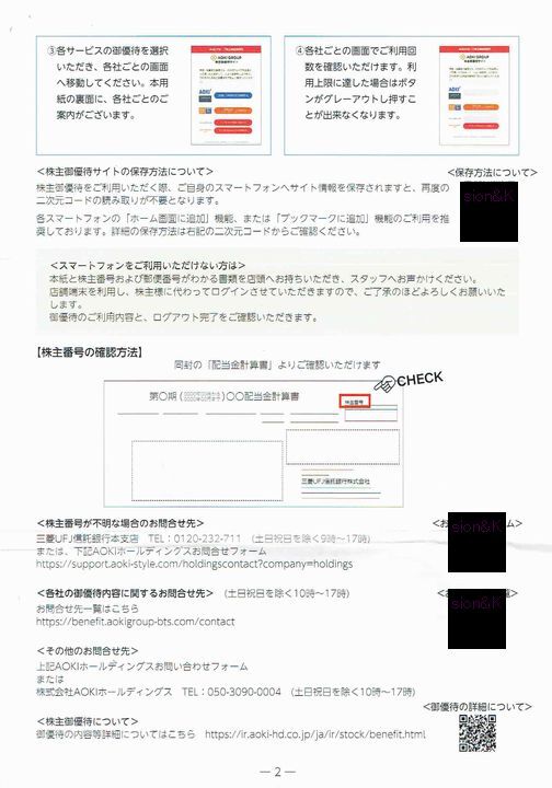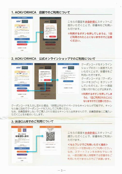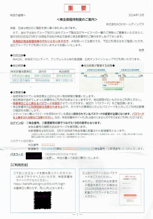 AOKI株主優待割引券1ID分です。 3ID分あります。ご入用の数でご入札ください。 落札、ご入金後、取引ナビより落札者様のメールアドレスをお知らせください。写メをお送りします。 どうしてもメールアドレスを教えたくない方は、写メのダウンロード用URLを取引ナビでお知らせします。 現品をご入用の場合は、送料をご負担頂ければお送りします(落札後にご相談に応じます)。 他の株主優待券もこちらに出品していますので、よろしければご利用ください。 このオークションは即決ですので、「入札=落札」です。 オークション終了時刻に関係なく、どなたかにご入札を頂いた瞬間に終了になる「早い者勝ち」です。 |