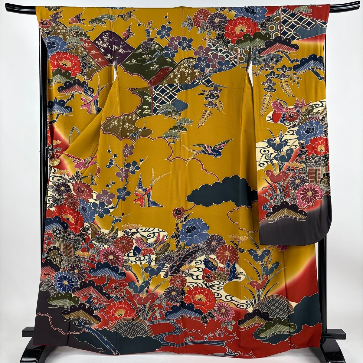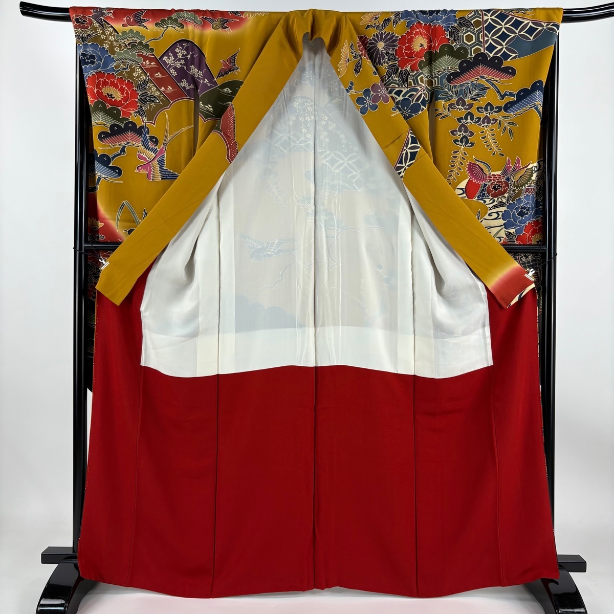 振袖 美品 名品 落款 御所車 花鳥 染め分け ぼかし 山吹色 袷 身丈166 裄丈68 L 正絹 【中古】 |