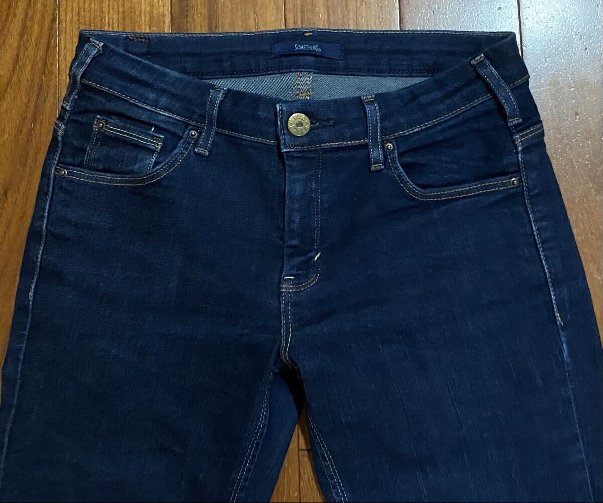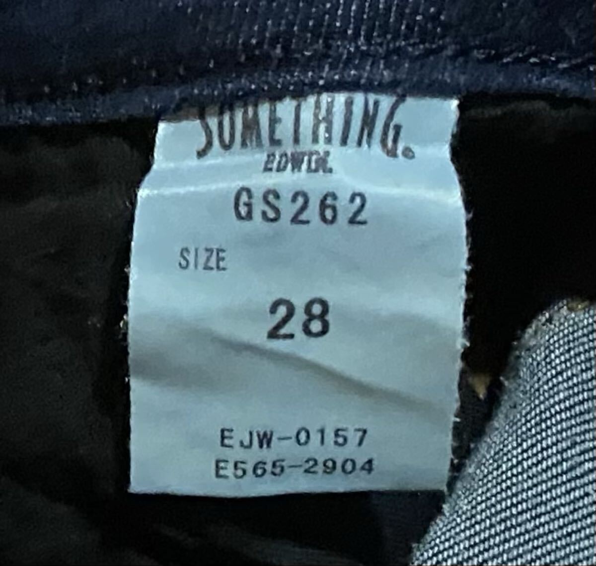 サムシングのストレッチデニム(ジーンズ)、GS262 EJW-0157 E565-2904です。色はインディゴブルーです。USEDですが状態は良いです(10段階中8程度)。ジッパーフライ、裾はチェーンステッチです。生地はストレッチ入りで綿76%、レーヨン13%、ポリエステル10%、ポリウレタン1%です。正規品です((株)エドウィン、日本製)。サイズはW28でウエストは重ねずに平置きで約69cm、ヒップ約84cm、股上約21cm、股下約79cm、股下15cmのふともも部分約43cm、裾まわり約32cm、重量約470gです。発送はゆうパケットポストになります。