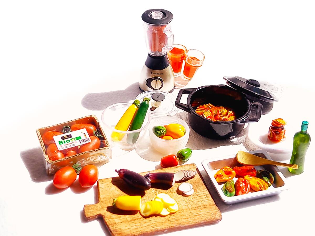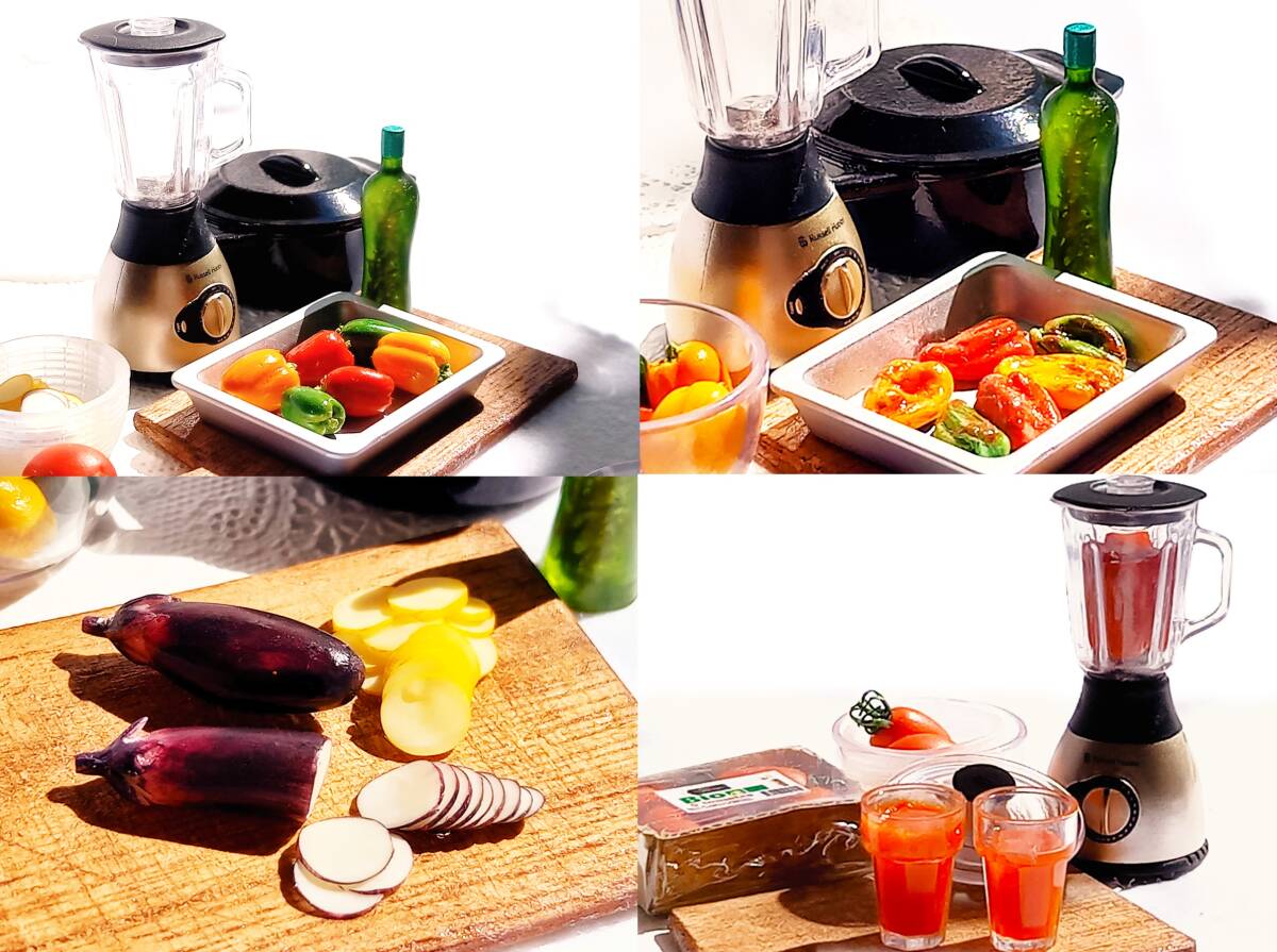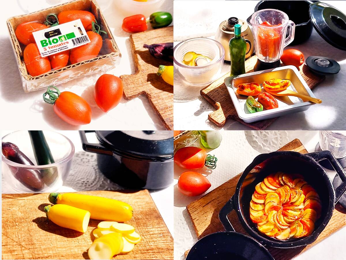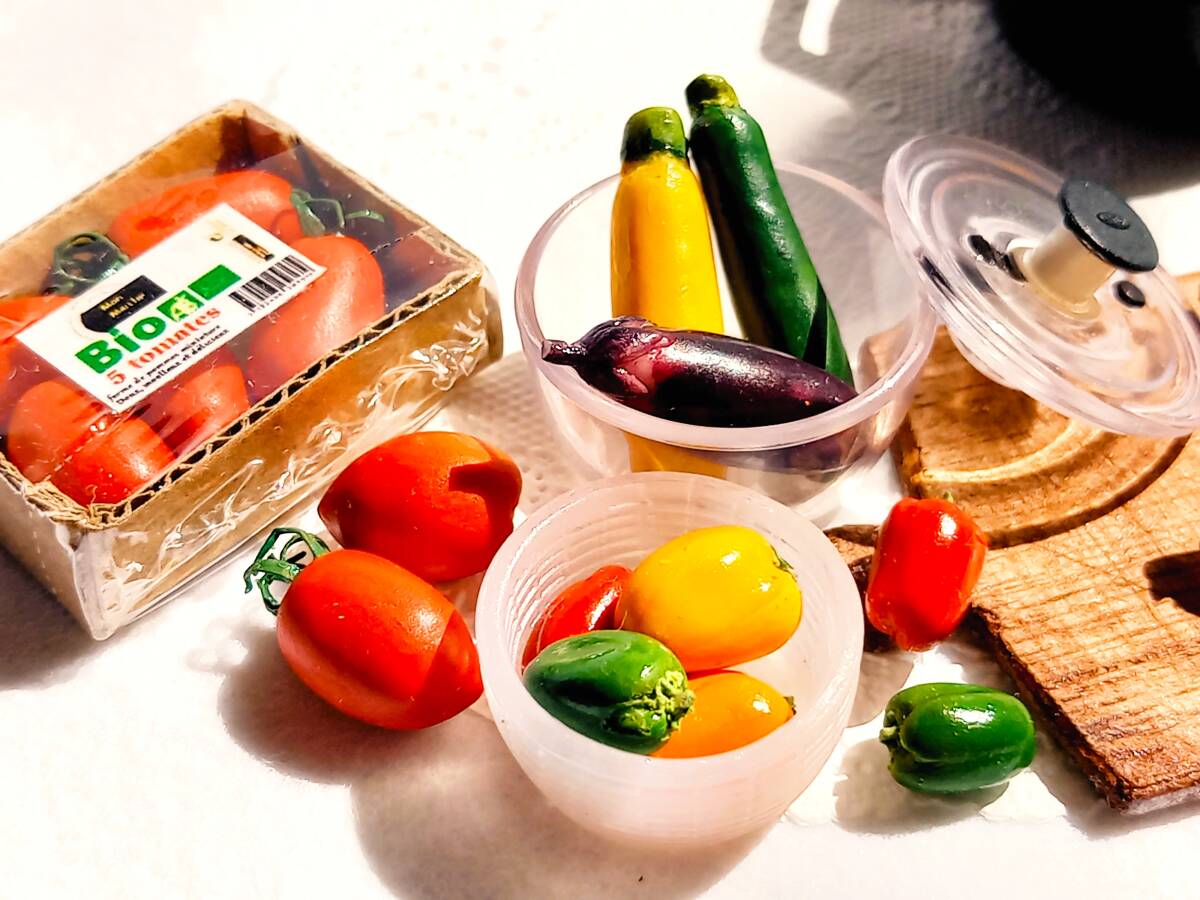 上記の新品ミニチュア3種に、ハンドメイドの食材などを添えてラタトゥイユのクッキングセットにしてみました。