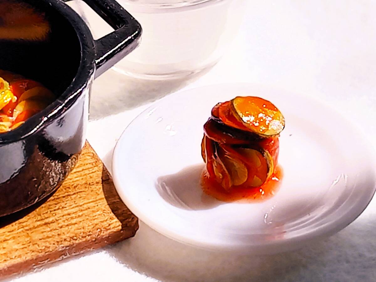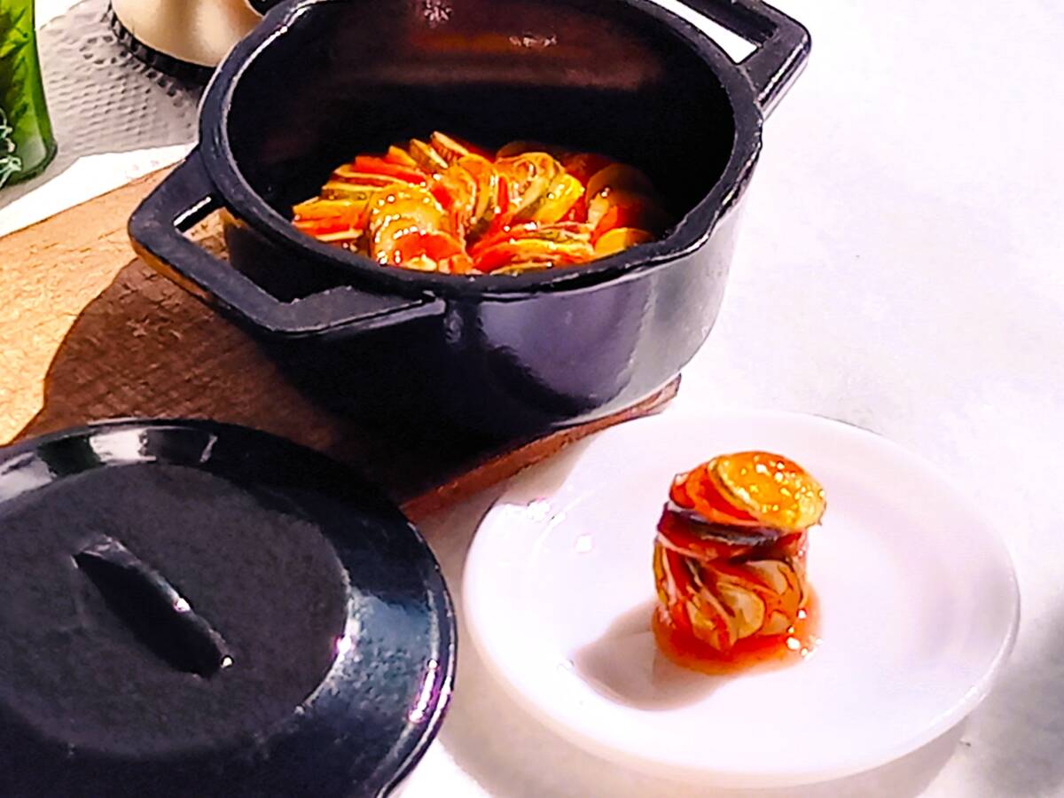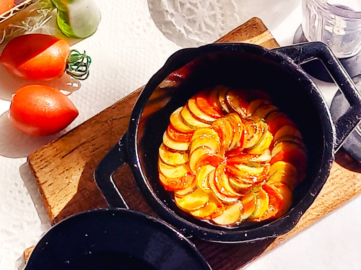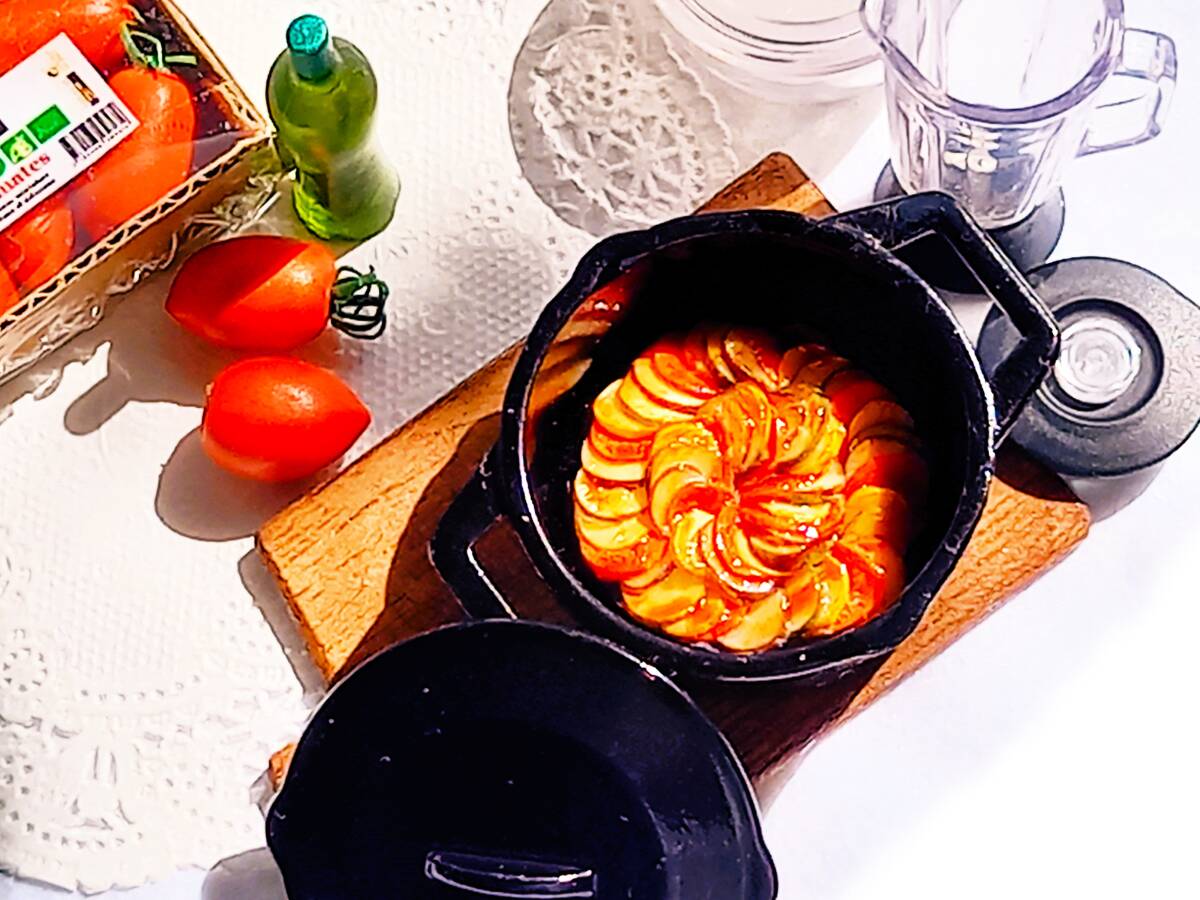 上記の新品ミニチュア3種に、ハンドメイドの食材などを添えてラタトゥイユのクッキングセットにしてみました。
