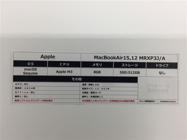 | MacBookAir 2024年 MRXP3J/A【安心保証】 |