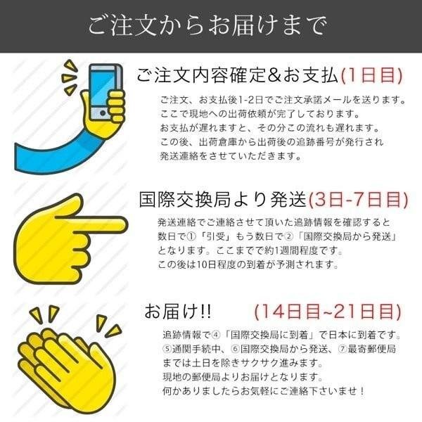 | <font size=2>当店のお品物は</font><font size=4 color=red>全品送料無料</font><font size=2>でお届けしております! 本商品は海外からの直送品となります。お安くご提供するため、商品発送から到着までに<font size=4 color=red>2-3週間程度</font>お時間を頂戴しております。航空便の状況によっては到着までに1ヶ月程度必要とする場合もございますので予めご了承ください。 基本的に追跡情報ありの国際郵便かeパケットでの配送となります。配送中のご質問もお問い合わせをいただければ都度確認しご連絡差し上げますので、ご安心くださいませ。</font> |