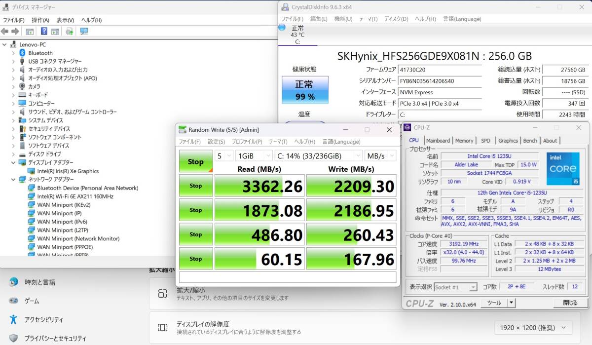 | CPU: 超高速 Intel 10コア 卓越性能 第12世代Core i5-1235U 1.3Ghz、 10コア12スレッド (ターボ・ブースト利用時の最大周波数 4.4GHz) |