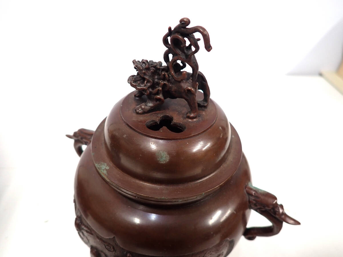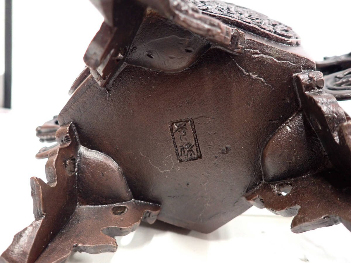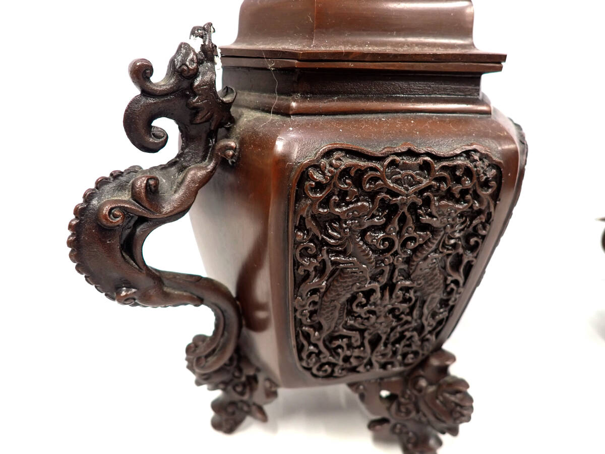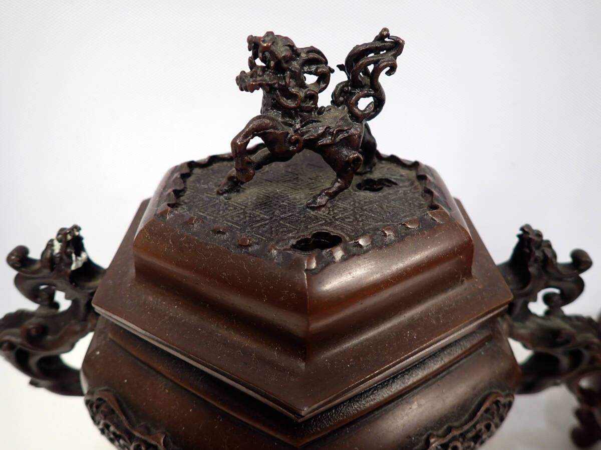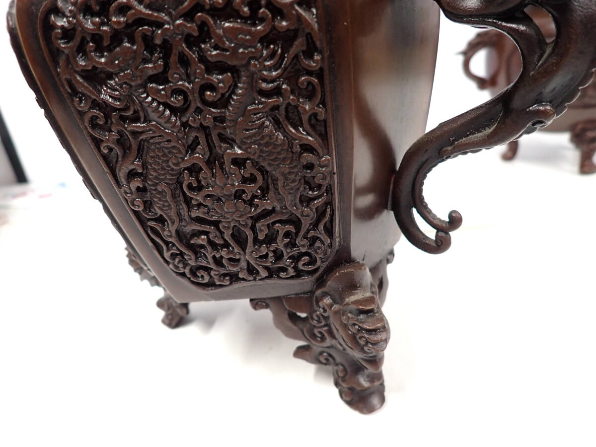 ・高岡銅器の名工【米田秀保】/能作吉秀 鋳銅 双龍文龍耳六角香炉 2個セット 茶道具 煎茶器 中国