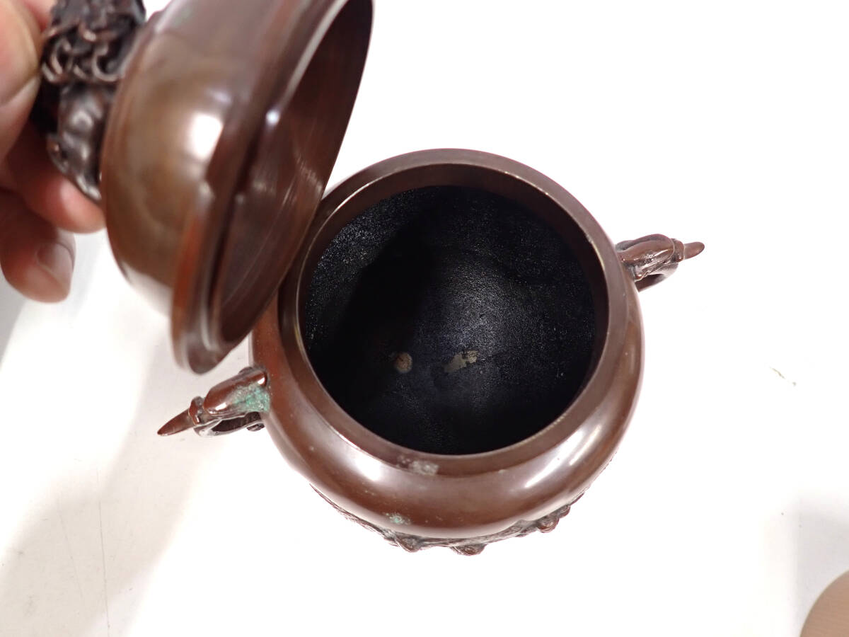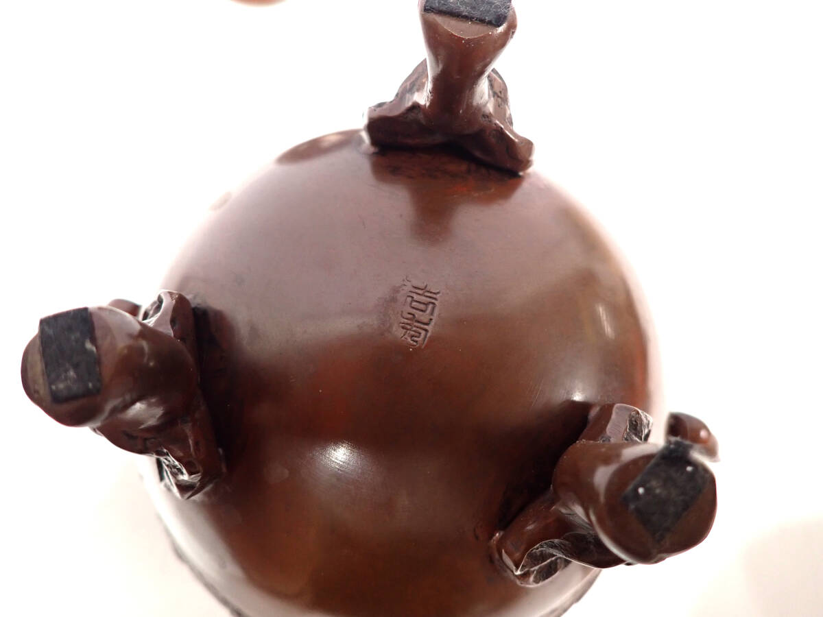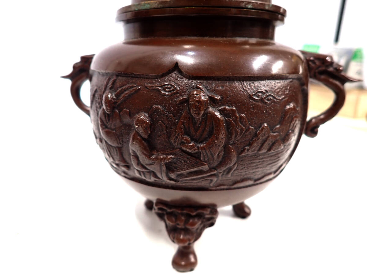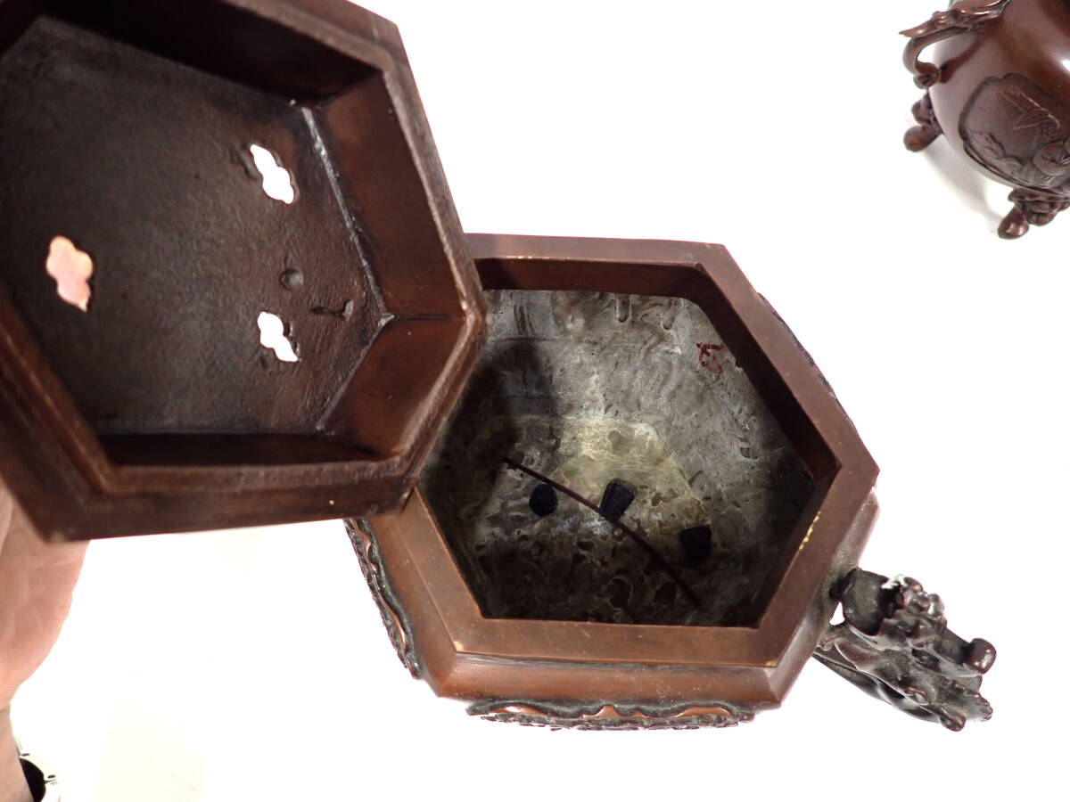 高岡銅器の名工【米田秀保】/能作吉秀 鋳銅 双龍文龍耳六角香炉 人物刻 3足香炉 2個セット 茶道具 煎茶器 中国 管1238