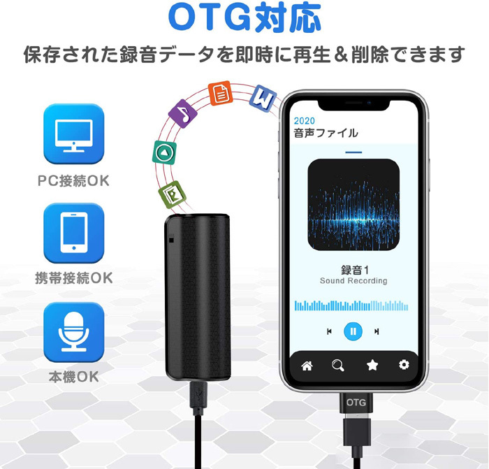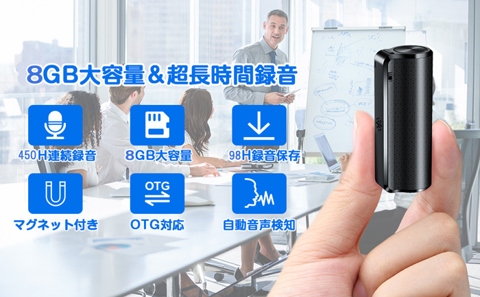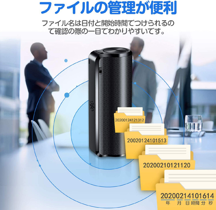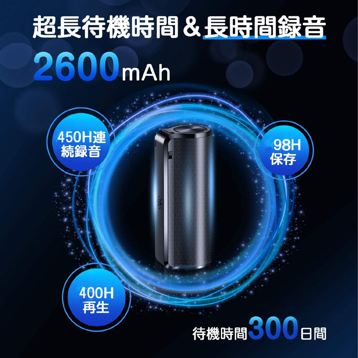 商品説明 | 【 2600mah超長時間連続録音のボイスレコーダー新登場! 】 充電式の2600mAhバッテリーを搭載しており、フル充電なら300日間超長待機と450時間連続録音可能で日常生活に十分ご利用いただえます。 *操作簡単・ワンキー録音 初めて方、機械が苦手な方でも簡単に使うことができます。 ・電源ON→録音開始 ・電源OFF→録音保存 *メモリカードの必要が無し、出張などの場合にも安心です。 *録音音質:WAV 192 Kbps(デフォルト)で高音質。360°ステレオマイク 高感度ステレオマイクで360°の音声を絶対ミスしないように拾ってくれます。192kbpsの音質の録音を可能! *小型超軽量なデザイン】サイズ:約7.1cm×約2.1cm×約2.7cm、重量 約63 gの小型なボディ。 *【便利な活用シーン】 ◆仕事の多人数での会議、打ち合わせ、商談、取材、インタビューの聞き漏れをなくすために。 ◆料理や語学学習などの習い事の際、先生の言葉を録音しておくことで復習にも使えます。 |