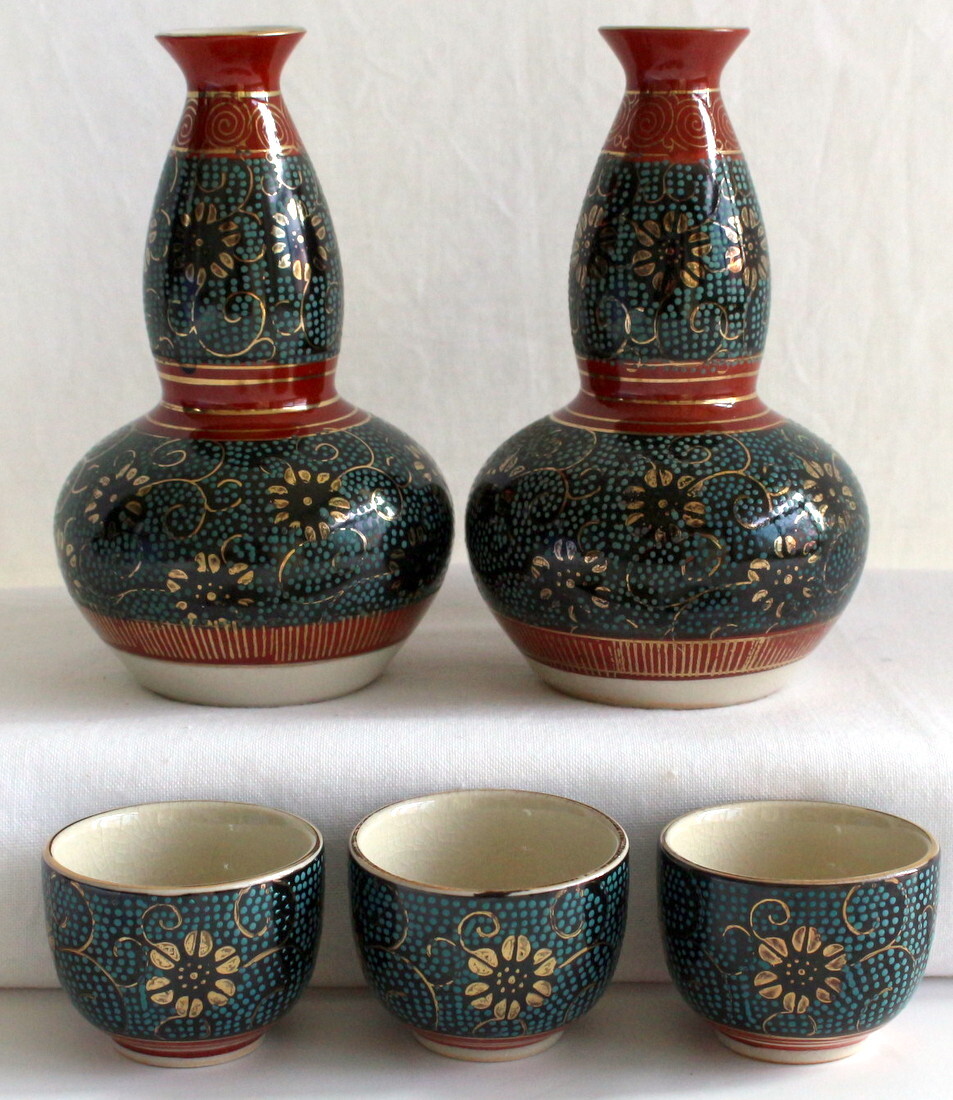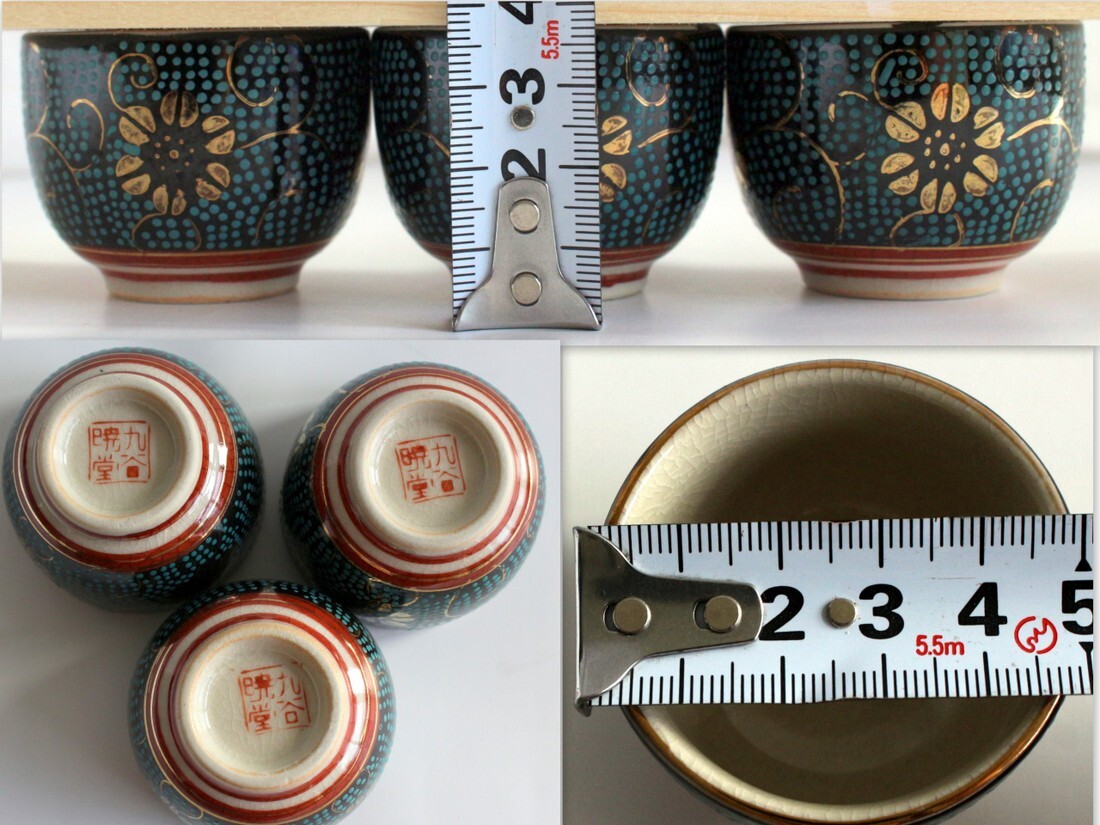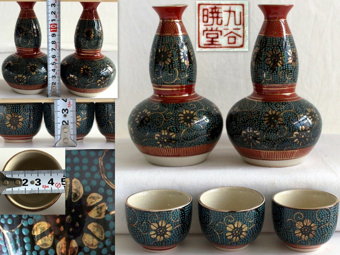 1427/中古/九谷焼 九谷暁堂 青粒鉄仙 酒器 ひょうたん徳利2点 /盃3点(ぐい呑・お猪口)