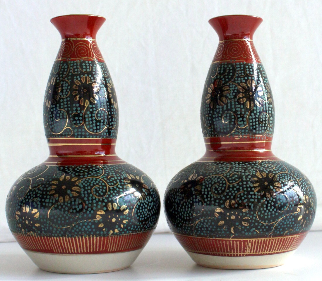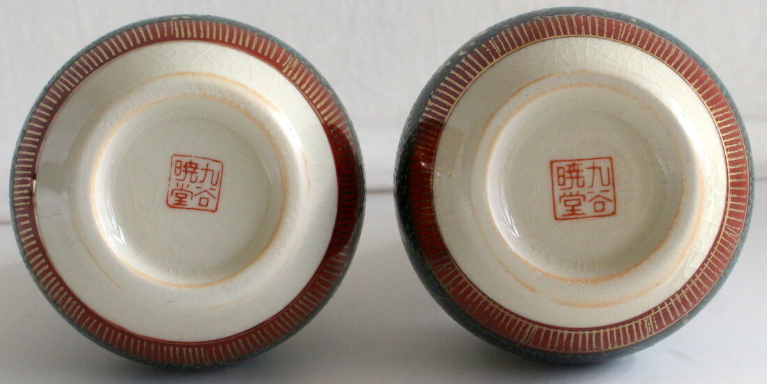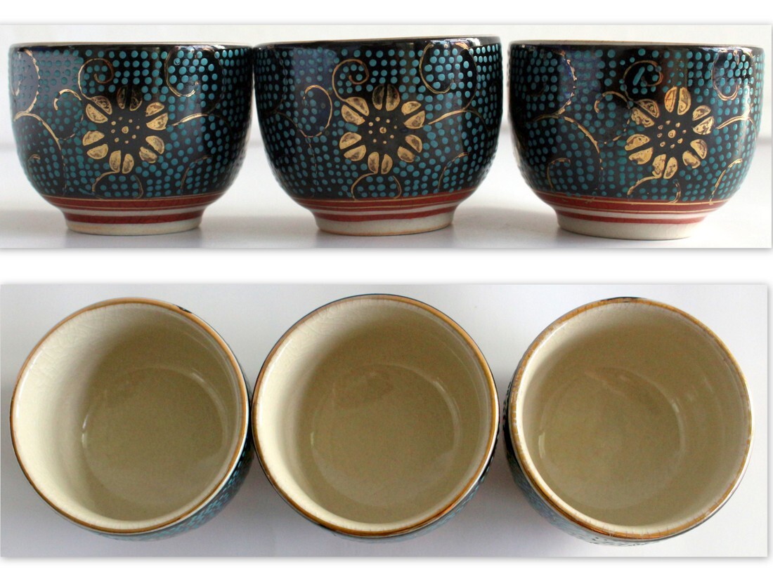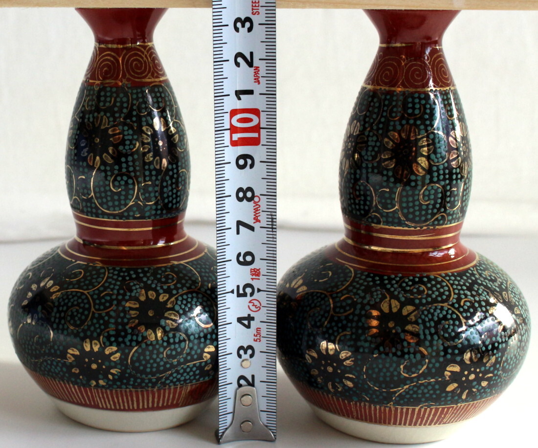 1427/中古/九谷焼 九谷暁堂 青粒鉄仙 酒器 ひょうたん徳利2点 /盃3点(ぐい呑・お猪口)