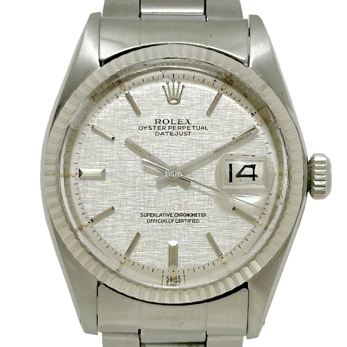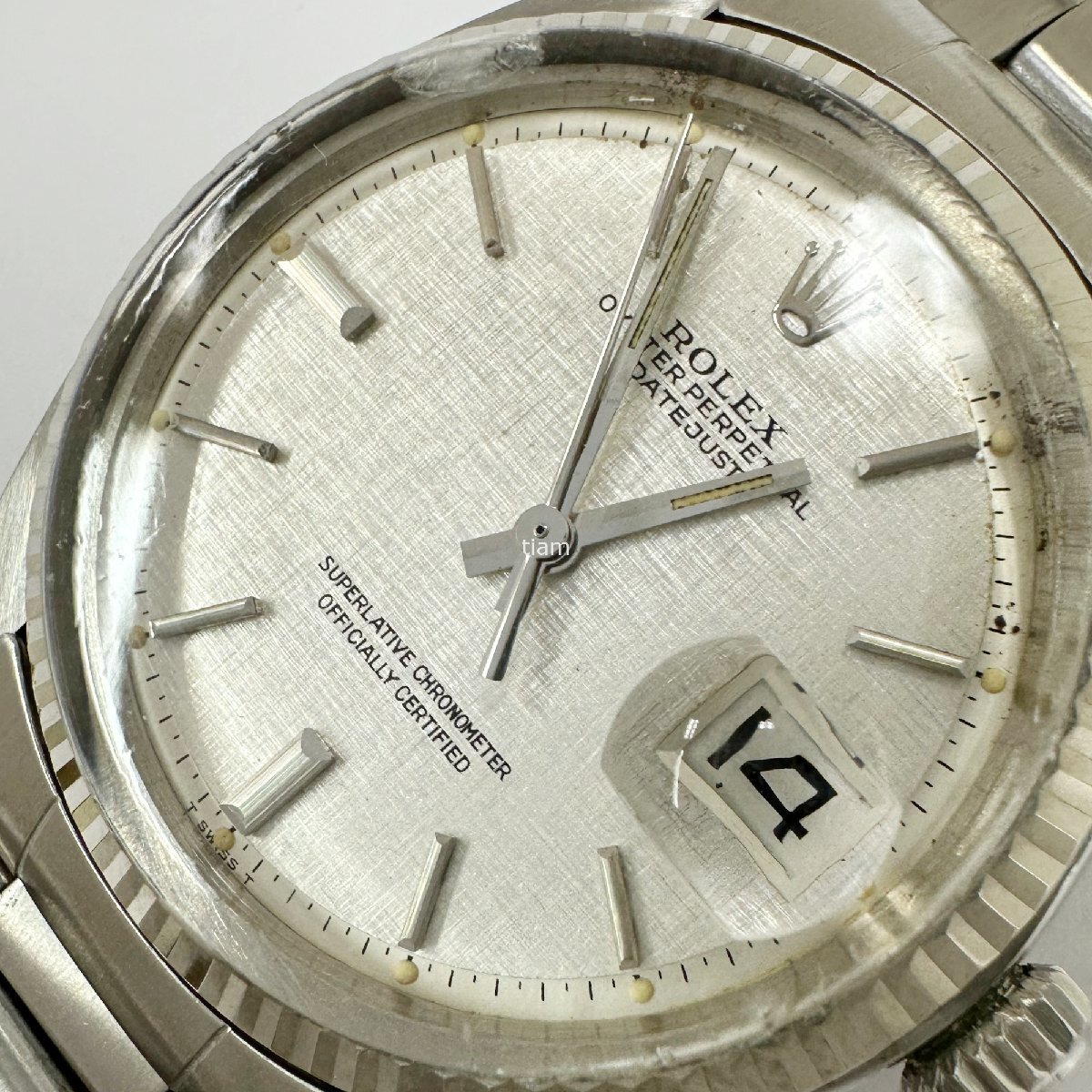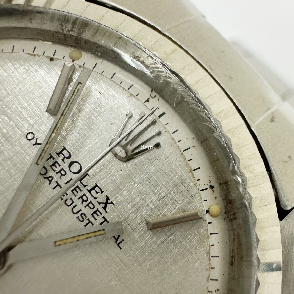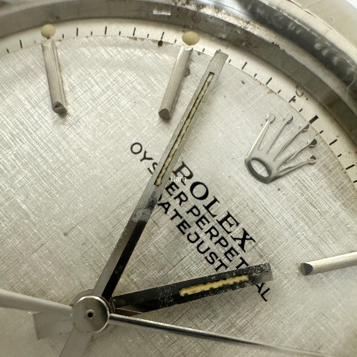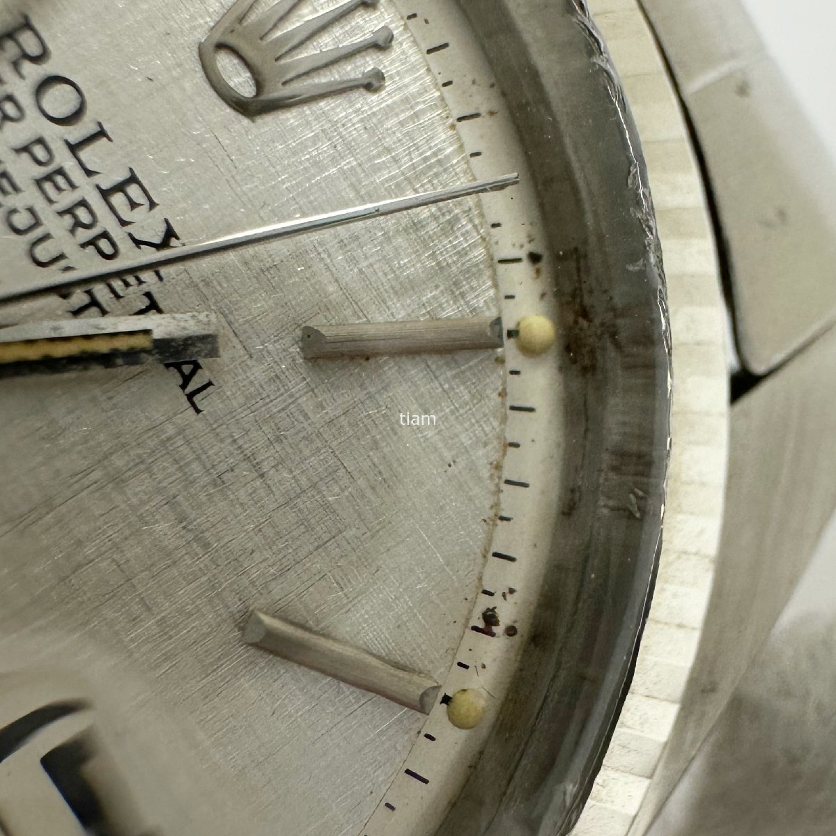 | ガラス: フチに傷がございます。 ダイヤル/針: 内側フチにサビ付着、針に変色がございます。 ケース/ベゼル: 磨き済みのようですが、残り傷がございます。 ブレス: バックルロックがやや緩いです。 その他: | ||