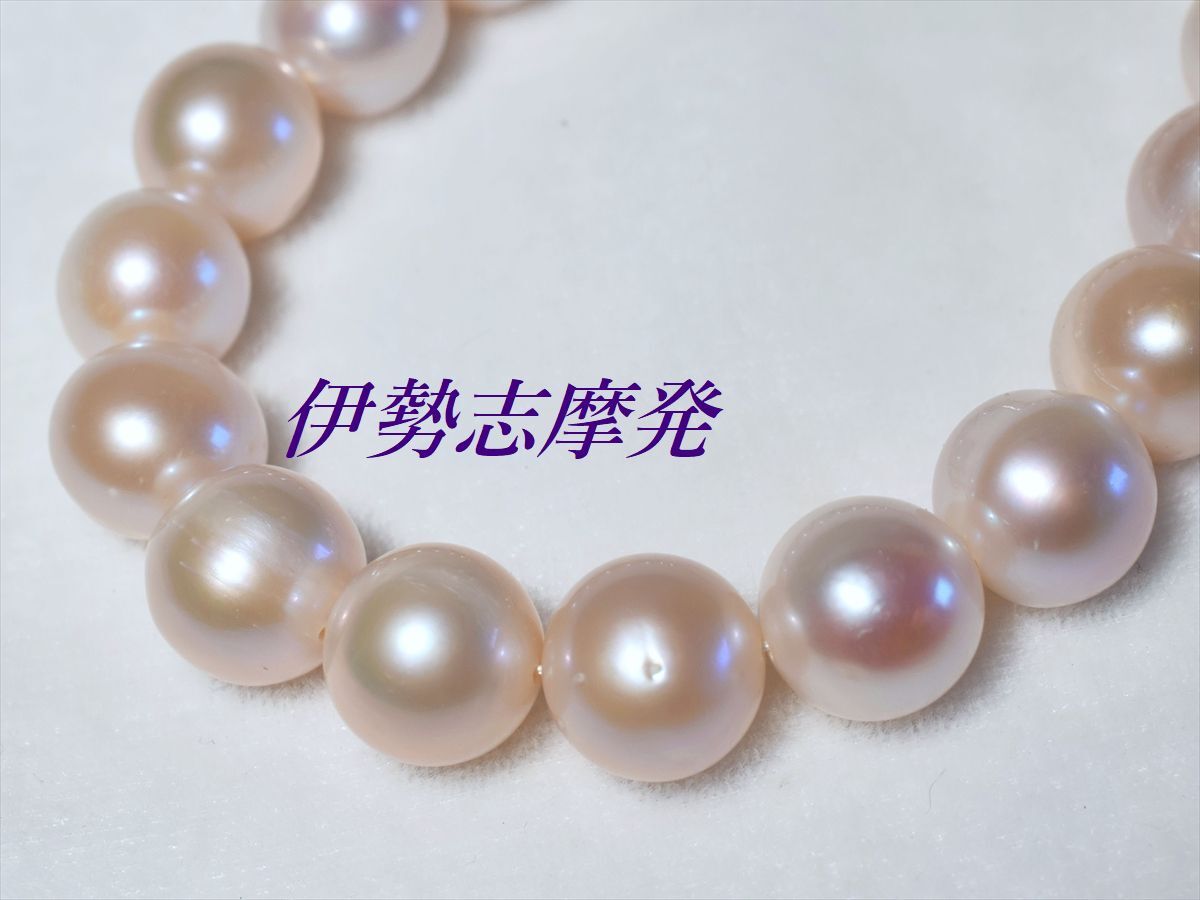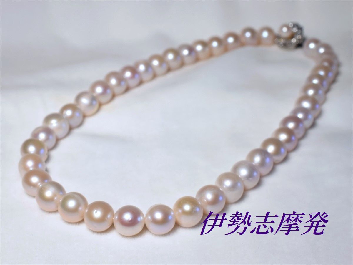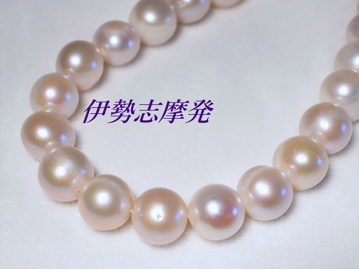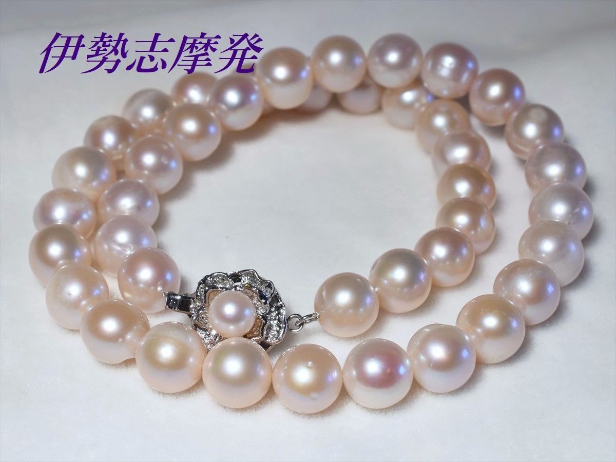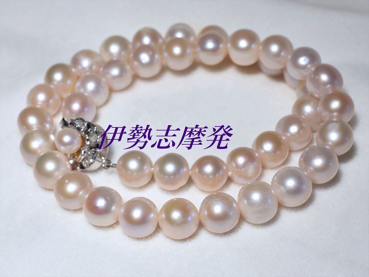 【真珠の種類】 淡水天然真珠 【珠サイズ】 10,5㎜-端9,7㎜ 【珠の形状】 大粒丸系 【色】 ホワイトピンク 【巻き】 良い◎ 【照り】 良い◎ 【キズ】 少し 【エクボ】 カスレ少し 【金具の材質】 シルバー製 【デザインの大きさなど】 クラスプ含んだ全長43cm ◆お洒落♪王道ホワイトの大粒パールネックレスは、流行に左右されない永遠のスタンダードアイテムです。◆ 様々なシーンを輝かせる洗練された淡水パール、ピンクの出た優しい色合いのネックレスです。デコルテを美しく飾り、大珠なので存在感も抜群です! 天然パールのためカスレや瑕は混ざりますが、欠けや剥がれもなく着けていて(社交距離だと)目立つものではありません。 冠婚葬祭は勿論の事パーティーシーンなどにも充分相応しい存在感&高級感があり、またTシャツやニットなどデイリーカジュアルに合わせれば一気にトレンド感のある大人スタイルになります。 大きく高級感があり、お洒落なデザインのシルバークラスプで仕上げました。クラスプにもキュートなベビー真珠が付いてます。 フェイクパールにはない重厚感と長くお使い頂ける本物の真珠を是非、淡水真珠で一本お揃え下さい。フォーマル過ぎずお洒落度が高い、使い勝手の良い大変重宝するアイテムです。 値上がり商品ですが、在庫があったので1万円を切っての大サービスで・・・2本お出しします。お目に留まったらお早くどうぞ。 | ||||||||