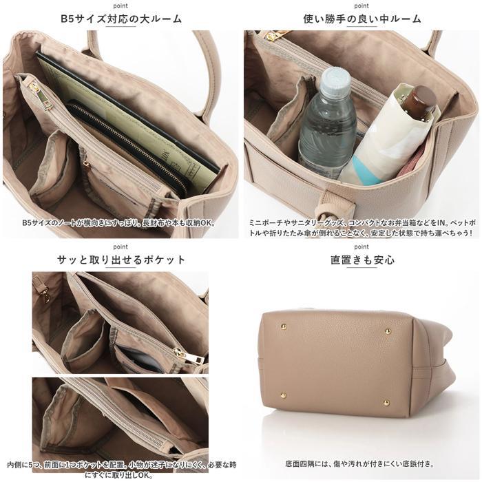 | 商品説明 | ・・オン・オフ問わず大活躍!cache cache(カシュカシュ)から、整理整頓がラクラク!ショルダー付きパーテーショントートが新登場。 ・【落ち着きのある仕上がり】 ・シボ感のあるフェイクレザーを使用。シーンを選ばず使えて、カジュアルにもキレイめにもマッチ☆ ・【安定感をキープ】 ・小物を収納しやすく安定感のあるスクエアフォルム。荷物を入れていない状態でも自立。 ・【持ち方を選べる2wayタイプ】 ・手持ちではもちろん、長さ調節可能なショルダーベルトを取り付けて肩掛けや斜め掛けも自在。ショルダーは肩に食い込みにくい幅広仕様。 ・【オープン開口】 ・開口部はガバっと開くオープンタイプ。中身が見やすく、取り出しもスムーズ。内側に目隠し布付き。 ・【仕切り付きの3ルーム仕様】 ・内側は3ルームに分かれており、急いでいる時も中身がひと目で確認できて誰でも収納上手に♪内生地は小物を傷つけにくい、しっとりとした生地感。(※仕切りの底は縫い付けられておりません。) ・【B5サイズ対応の大ルーム】 ・B5サイズのノートが横向きにすっぽり。長財布や本も収納OK。 ・【使い勝手の良い中ルーム】 ・ミニポーチやサニタリーグッズ、コンパクトなお弁当箱などをIN。 ・ペットボトルや折りたたみ傘が倒れることなく、安定した状態で持ち運べちゃう! ・【サッと取り出せるポケット】 ・内側に5つ、前面に1つポケットを配置。小物が迷子になりにくく、必要な時にすぐに取り出しOK。 ・【直置きも安心】 ・底面四隅には、傷や汚れが付きにくい底鋲付き。 ・【お気に入りをチョイス】 ・マットな質感に仕上げたトートバッグ。単色カラーやミックスカラーからお好みで選んで、お出かけのお供に♪取り外し可能なチャーム付き。 ・【ポケット仕様】 ・内側:オープンポケット×3、ファスナーポケット×2 ・前面:オープンポケット×1  |