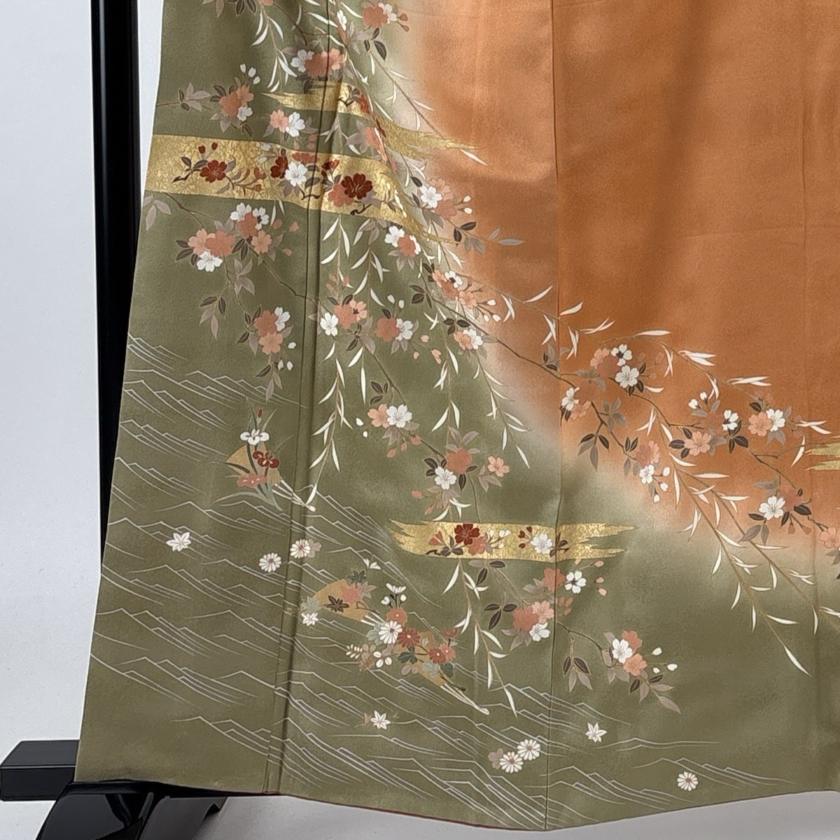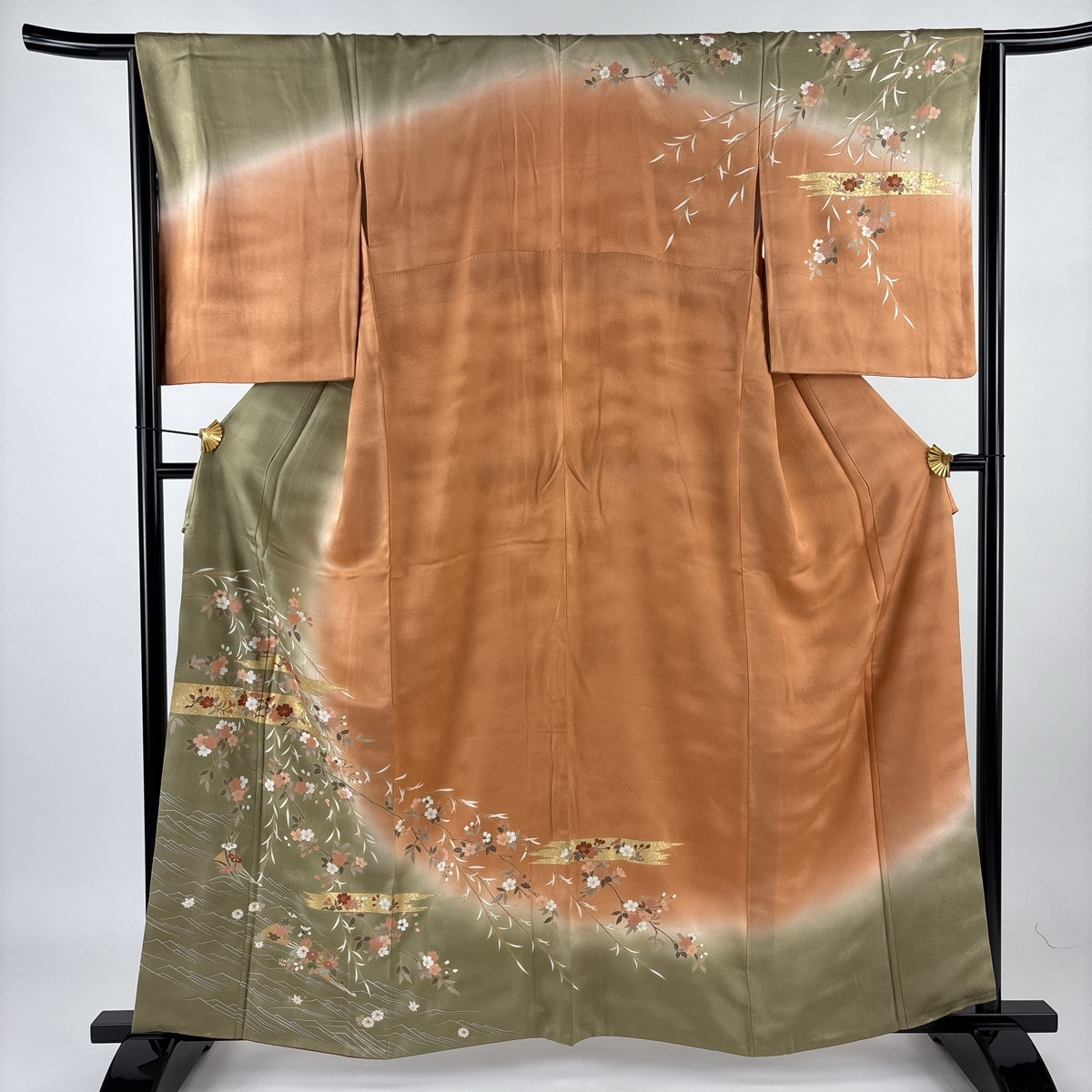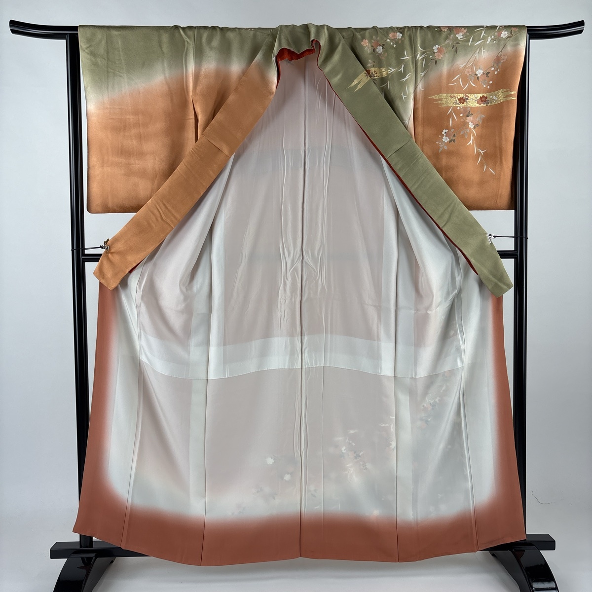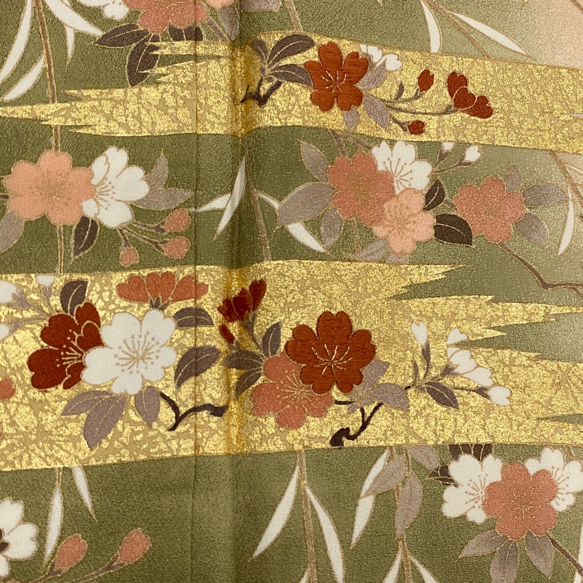 | 訪問着 秀品 鈴乃屋 桜 霞 金糸 刺繍 よもぎ色 袷 身丈160.5 裄丈64 M 正絹 【中古】 |