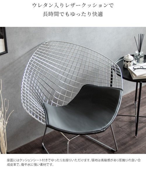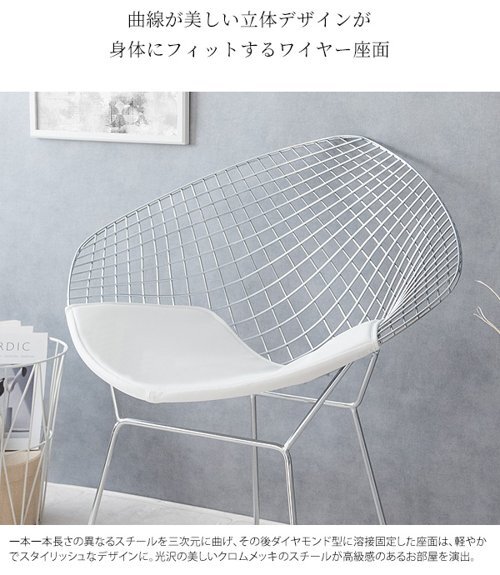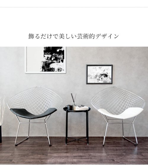 現在ご覧の商品ページはブラックのご購入ページとなります。 ヤフオクの仕様上単一ページに複数バリエーションを掲載することができませんので、他バリエーションが希望の場合は別ページでご購入お願い致します。 配達業者を指定いただくことはできません。 北海道/沖縄/離島のお届けに別途中継料金が発生します。 ※別途送料が発生する場合は後ほどご連絡させていただきます。 ミッドセンチュリーモダンを代表するデザイナー、ハリー・ベルトイアが20世紀の新しい家具を象徴するデザインとして大ヒットさせ、今もなお愛され続けている『ダイヤモンドチェア』のリプロダクト品です。 ダイヤモンドのような形状の美しい曲線のフォルムは、まるで座る人を招き入れてくれるかのよう。身体にフィットしてゆったりお座りいただけます。計算されたデザインは、網目からのぞく背景すらも取り込み、ひとつの作品としてお部屋を飾ってくれます。 座面クッションのカラーはホワイトとブラックの2カラーがあり、お部屋の雰囲気やお好みでお選びいただけます。 タイミングによっては在庫切れの場合があります。