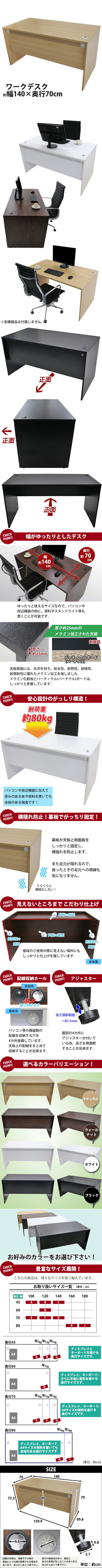 | 商品紹介 | ◆◆ワークデスク◆◆ ■作業スペースをゆったりと確保出来る、ワークデスクです。 ■天板には、メラミン加工を施しています。 ■幕板が天板と側面板をがっちりと固定!横揺れを防止します。 ■天板と幕板に配線収納ホールが2カ所ずつ備わっています。 ■アジャスターで高さの調節が可能です。(高さ調節範囲〜約15mm) ■材質:パーティクル(パーチクル)ボード(メラミン加工)(本体)、プラスチック(アジャスター、配線収納ホール) ■重量:約35kg ■耐荷重:約80kg ※こちらの商品は、組立て式です。組立てにはプラスドライバーが必要です。お客様でご用意下さい。 ※組立図が付属します。 ※カラーはナチュラルとなります。 |