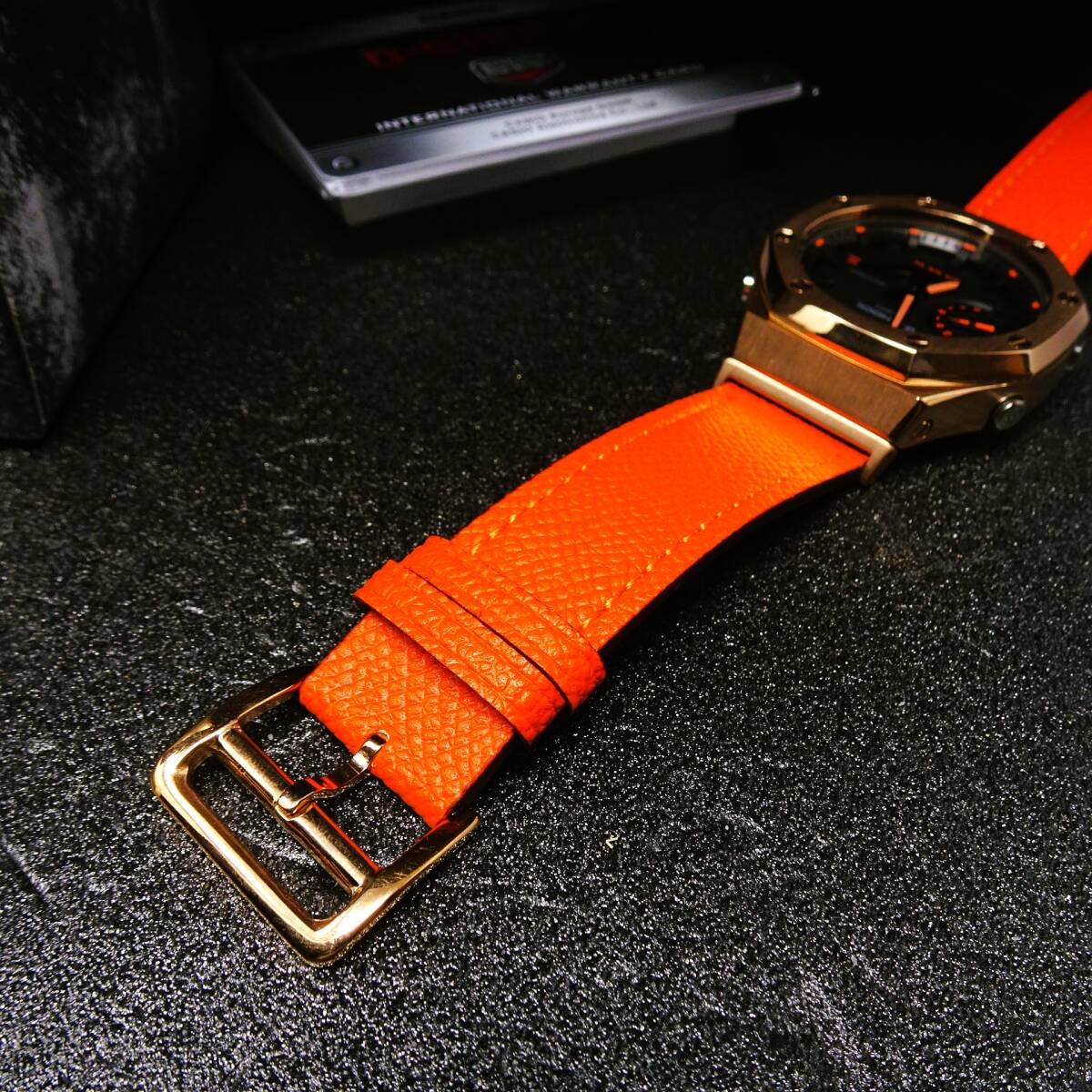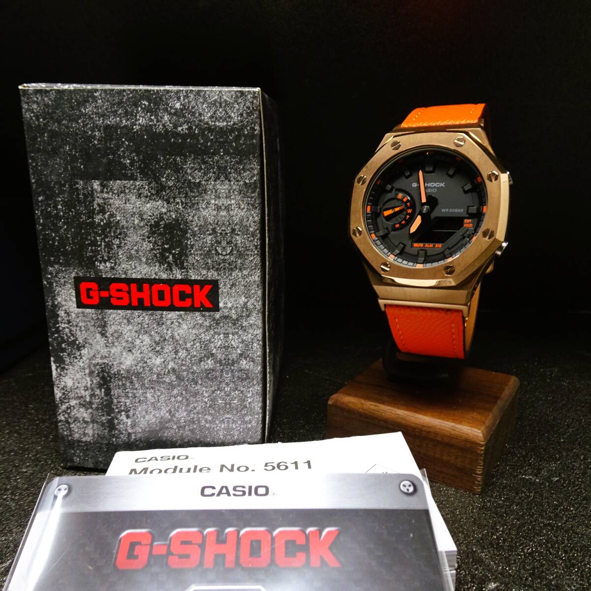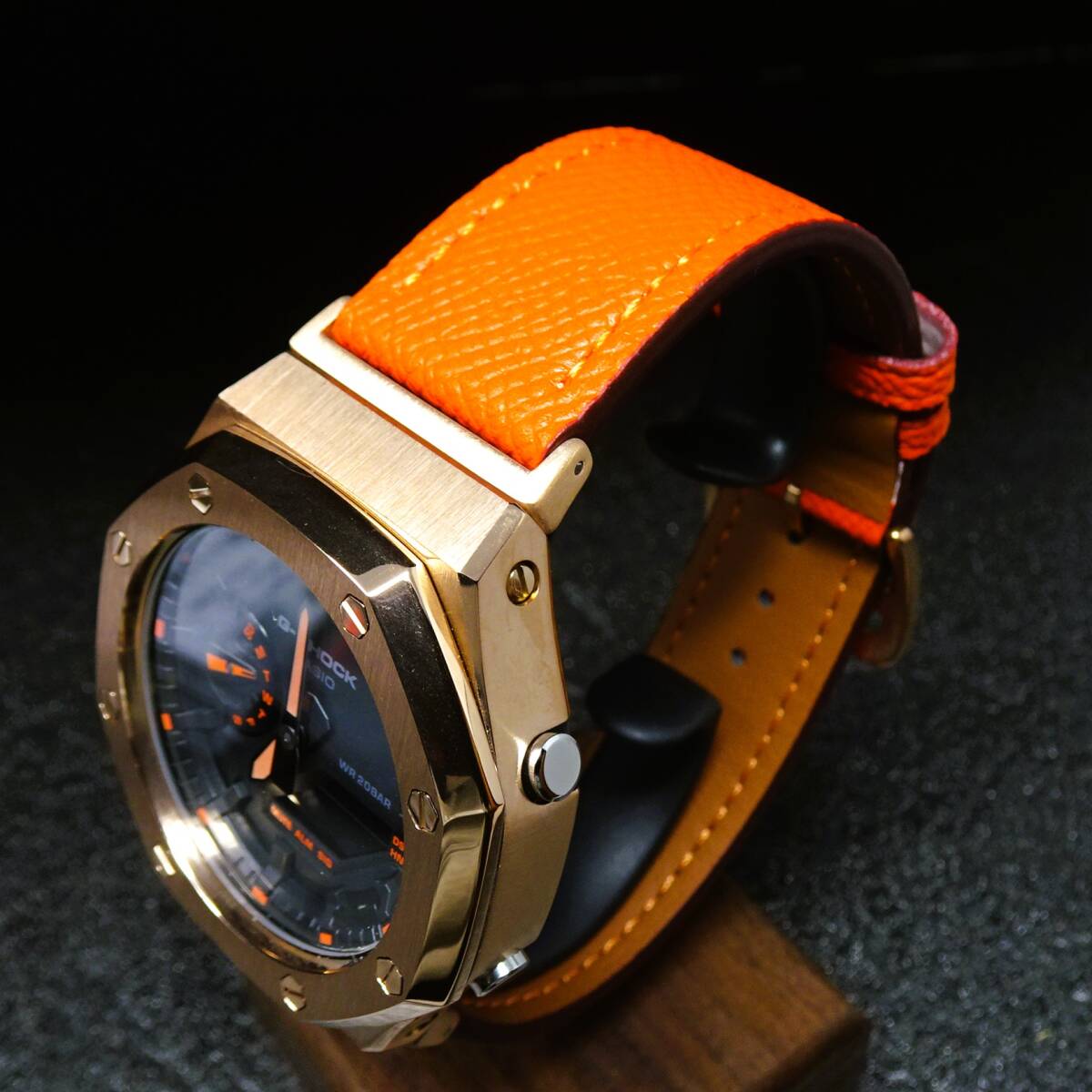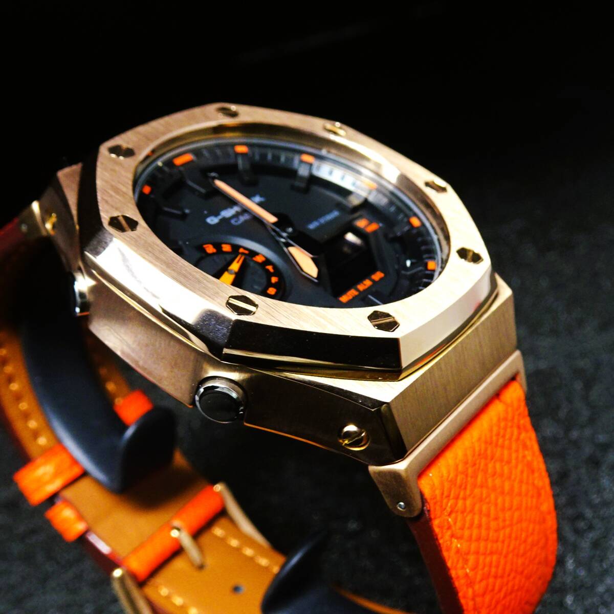 〓新品〓GショックCUSTOM・MADE腕時計〓正規品GA2100本体付ステンレス製シャンパンゴールドベゼル〓オレンジ本革レザーベルト〓カシオーク