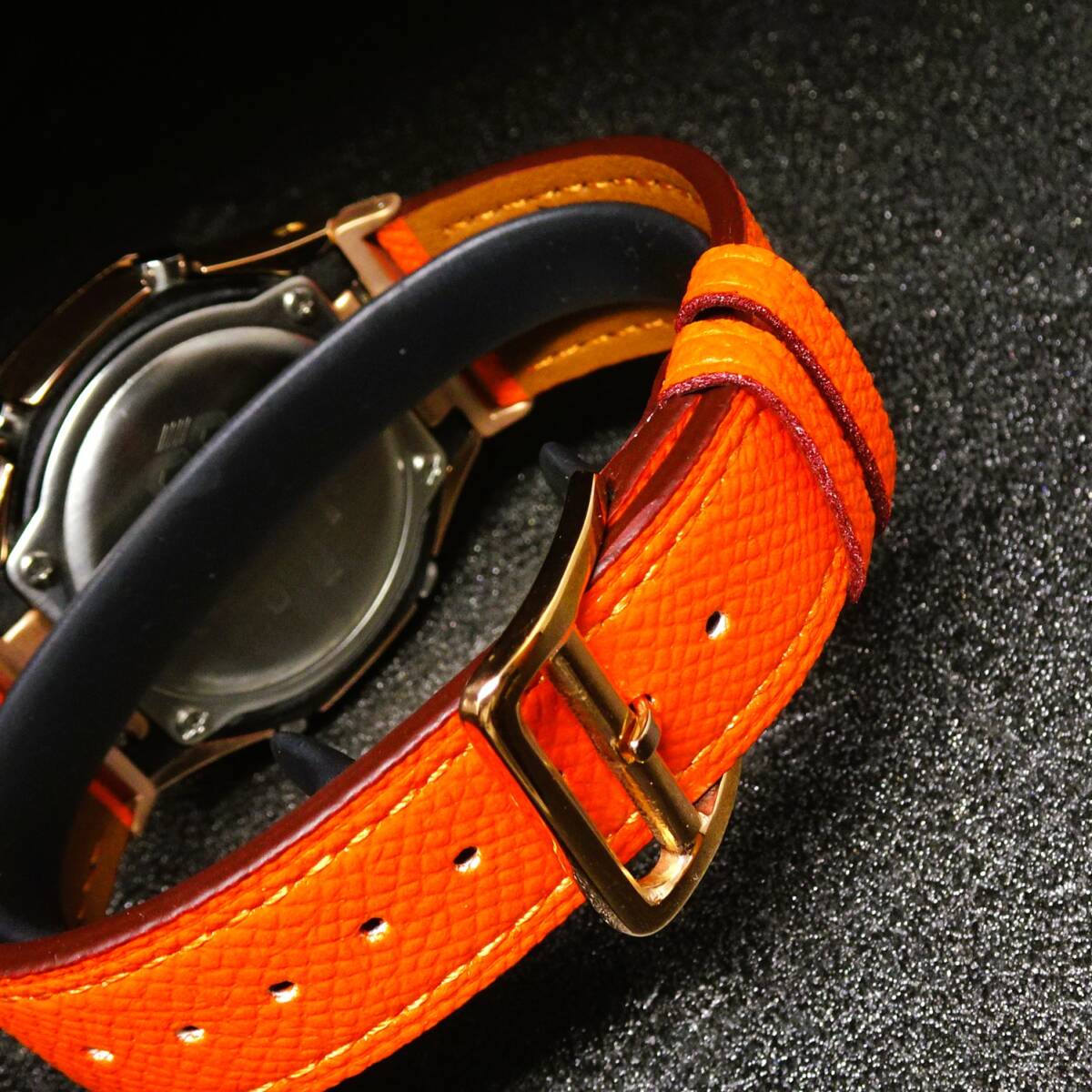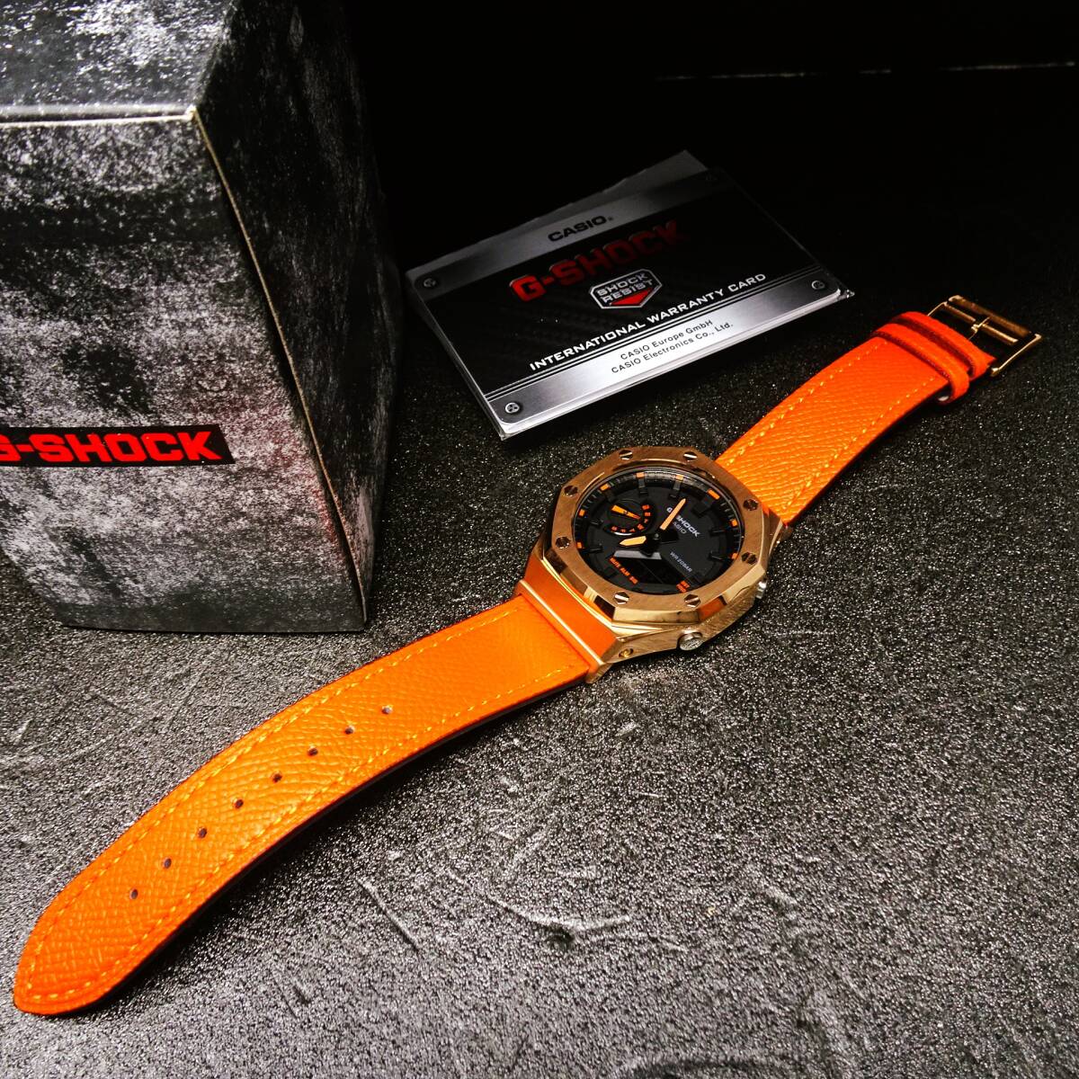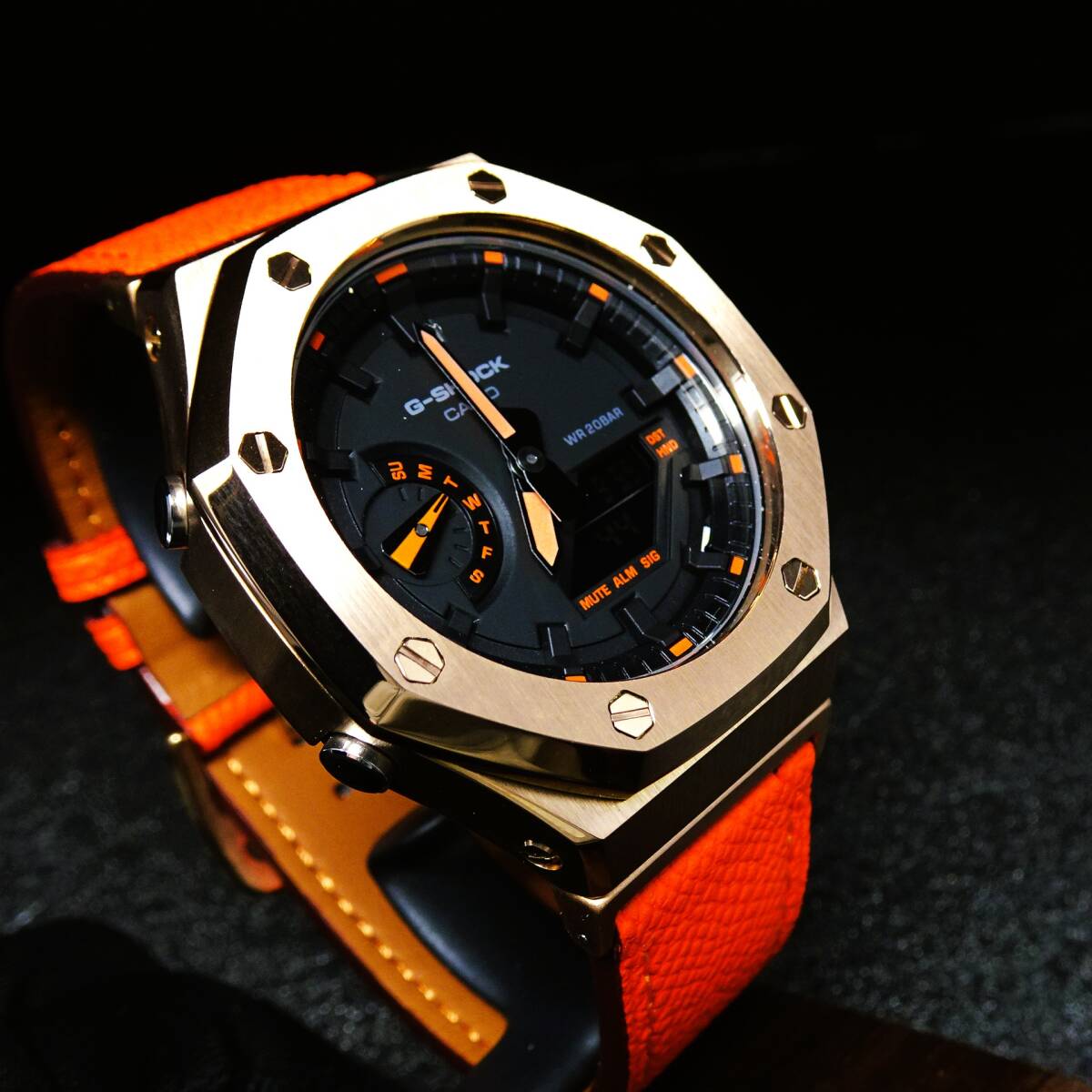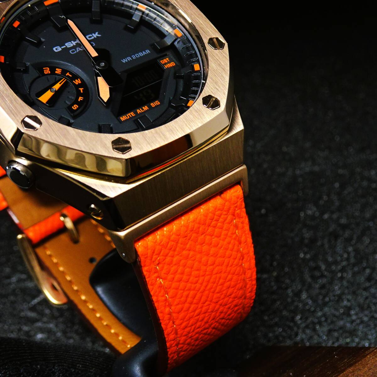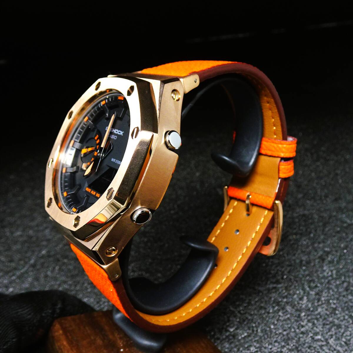 〓新品〓GショックCUSTOM・MADE腕時計〓正規品GA2100本体付ステンレス製シャンパンゴールドベゼル〓オレンジ本革レザーベルト〓カシオーク