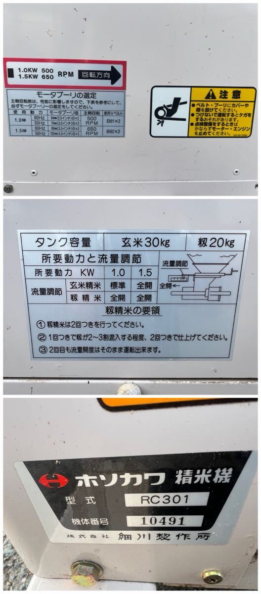 即決【5】★精米機★ 細川製作所 ホソカワ RC301 200V モーター外装型 モミ 籾 玄米 通電回転確認のみ 現状品