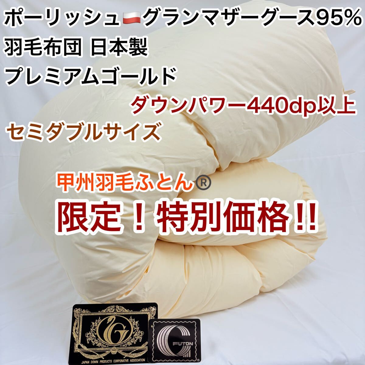 プレミアムゴールドラベル付き、ダウンパワー 440dp以上の羽毛布団が、とってもお買い得な価格で販売です