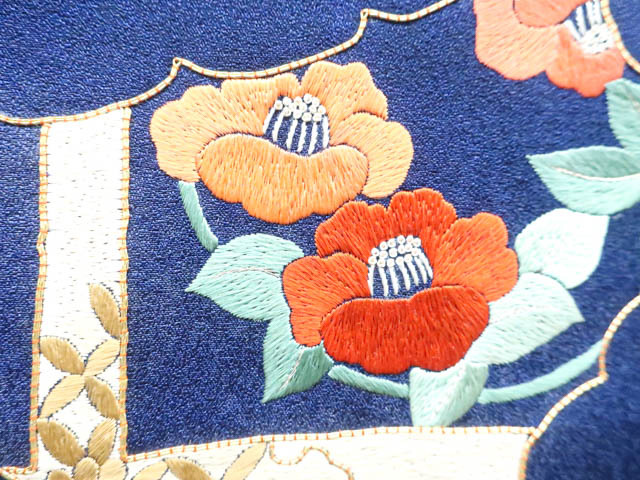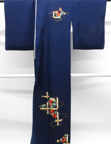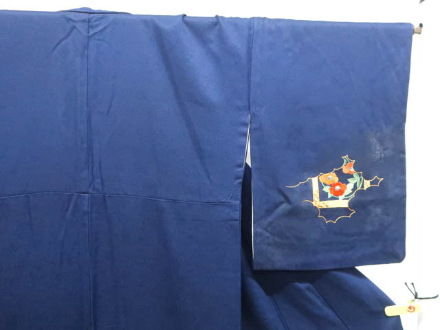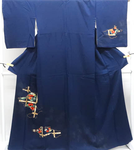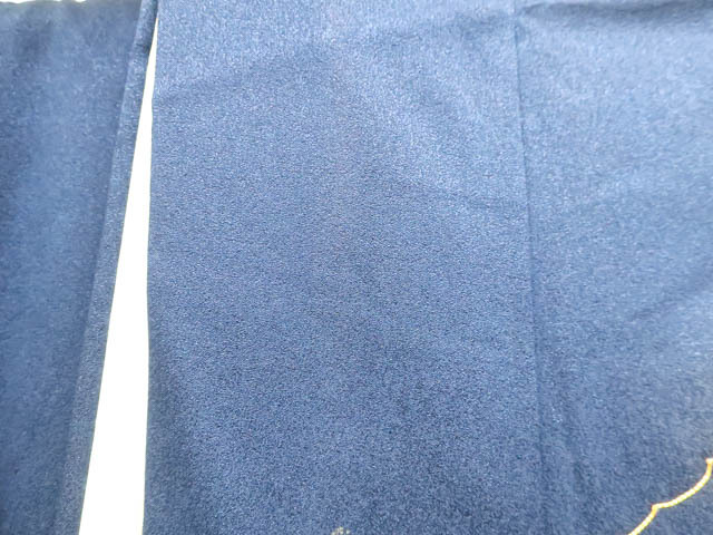 リサイクル商品のため、衿に薄汚れがございますが着用可能なお品です。 地色は紺です。 1枚目の画像が近いお色かと思われます。 素材は正絹です。 |