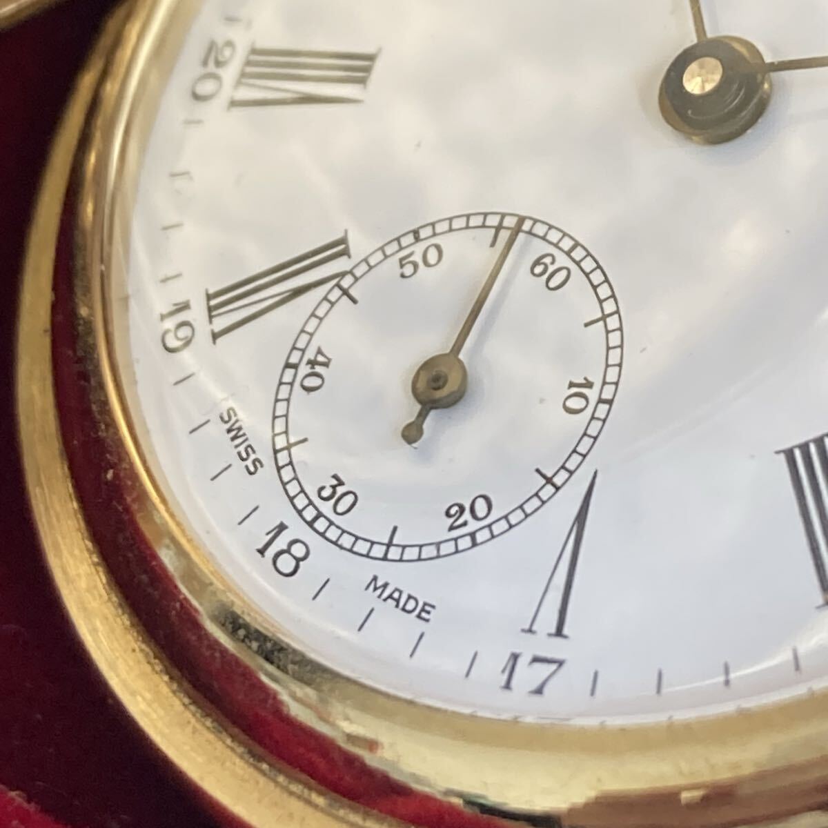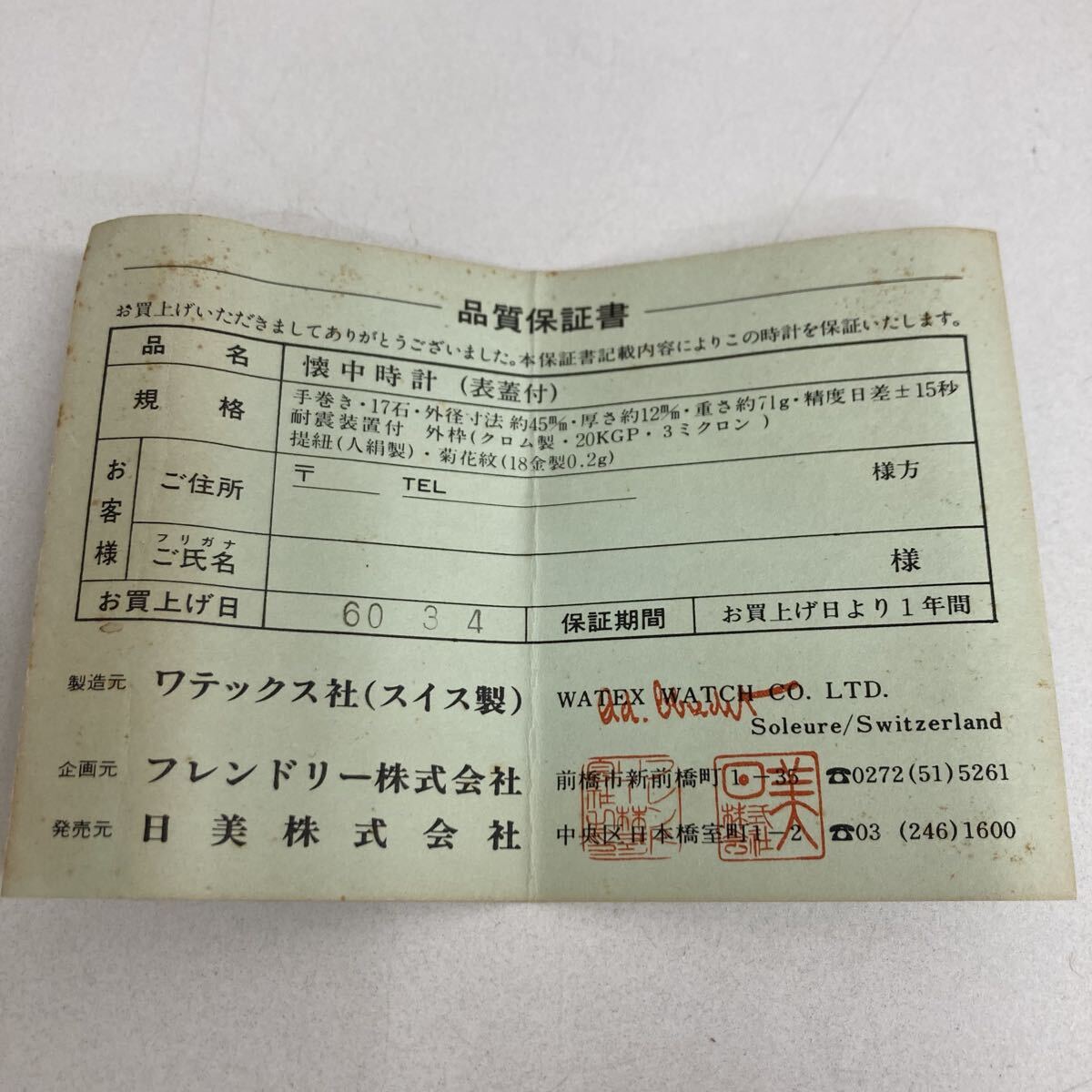 ■商品名:SH★ 1円スタート 中古品 WATEX ワテックス スイス製 懐中時計 手巻き 菊花紋 K18 18金 0.2g 使用 ケース、保証書付き 不動品 現状品