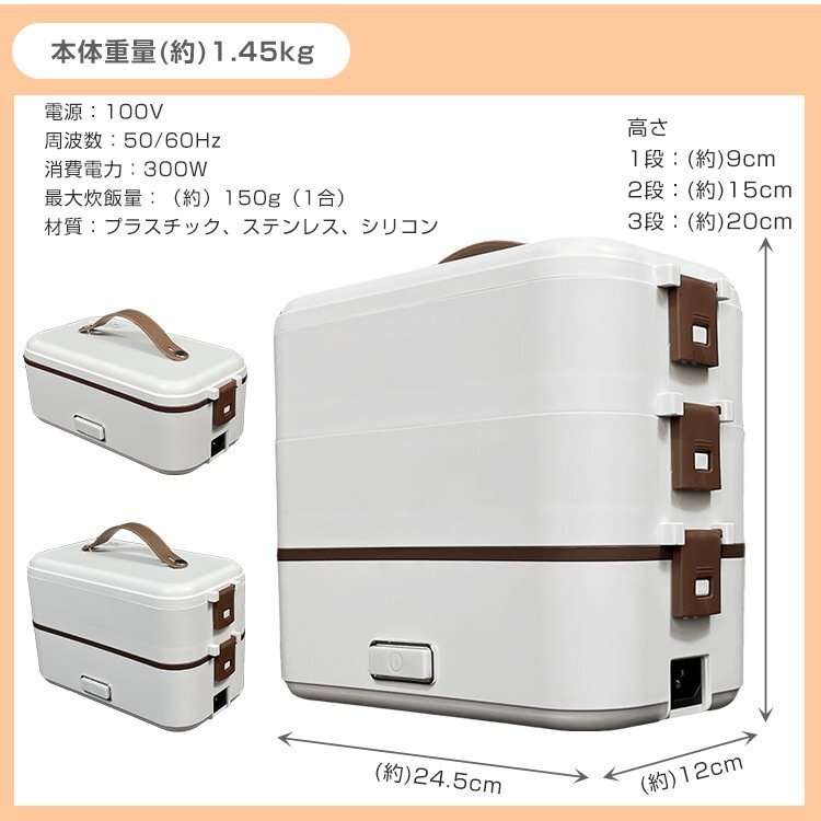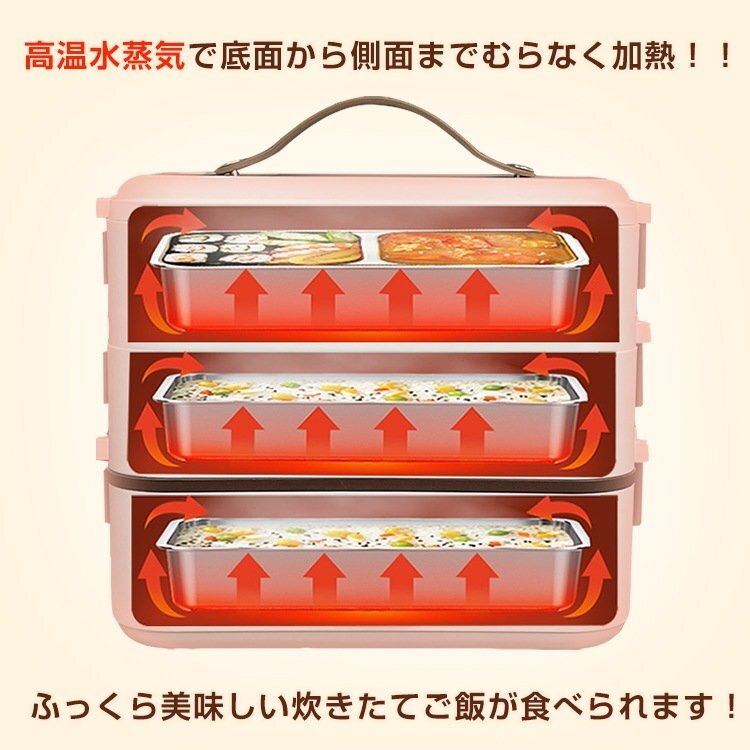 電気弁当箱炊飯器 3段式 加熱弁当箱 0.5~1.0合 炊く 蒸す 加熱 温め機能 ステンレス製 洗いやすい 軽量設計 スピード調理 自宅 会社 車中泊