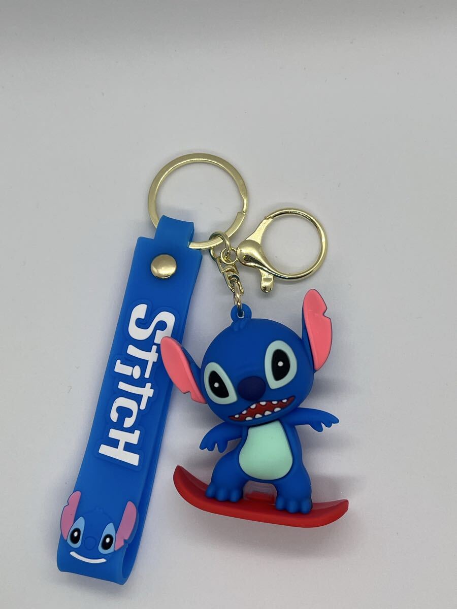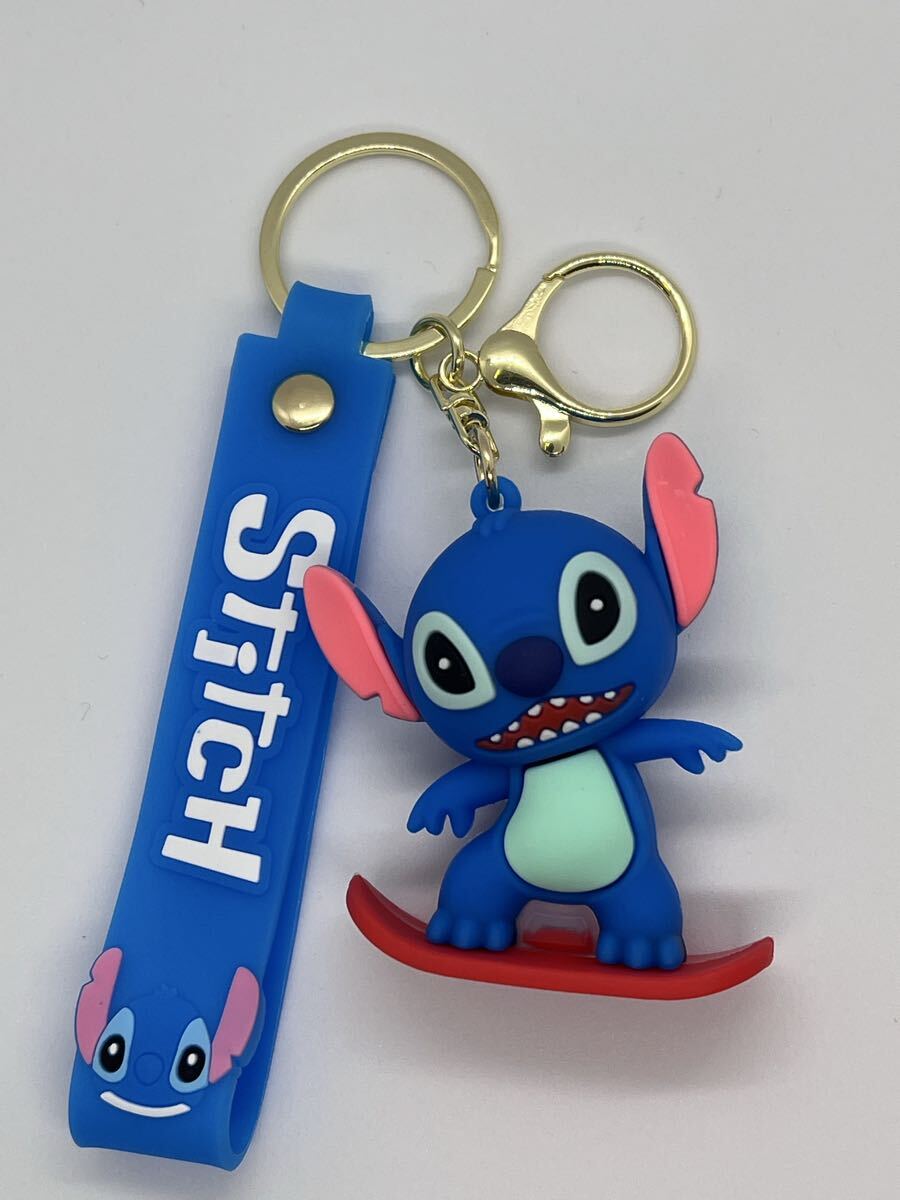 スノーボードをするスティッチのPVCキーホルダー。