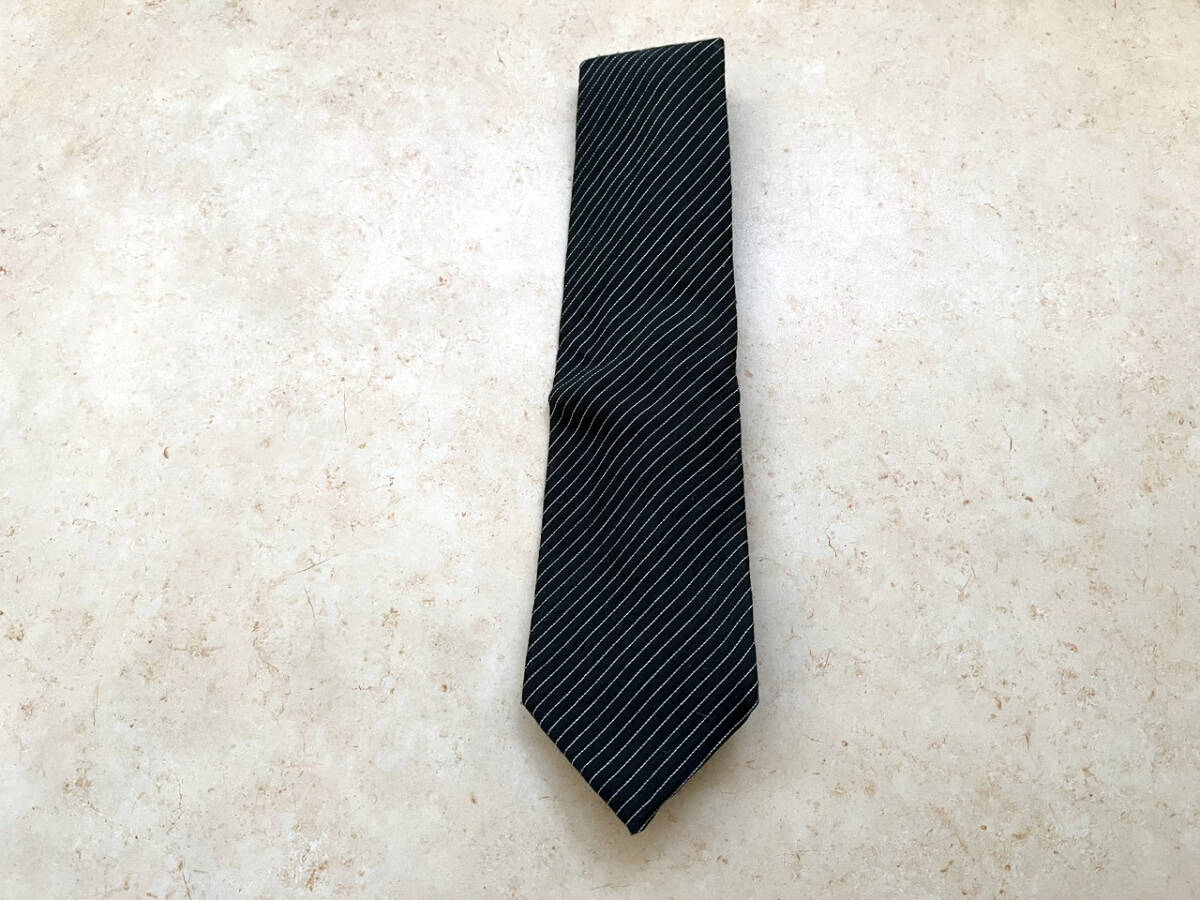 素材はシルク60%, コットン40%、黒系のベース地に銀系の細いストライプが入ったデザイン。