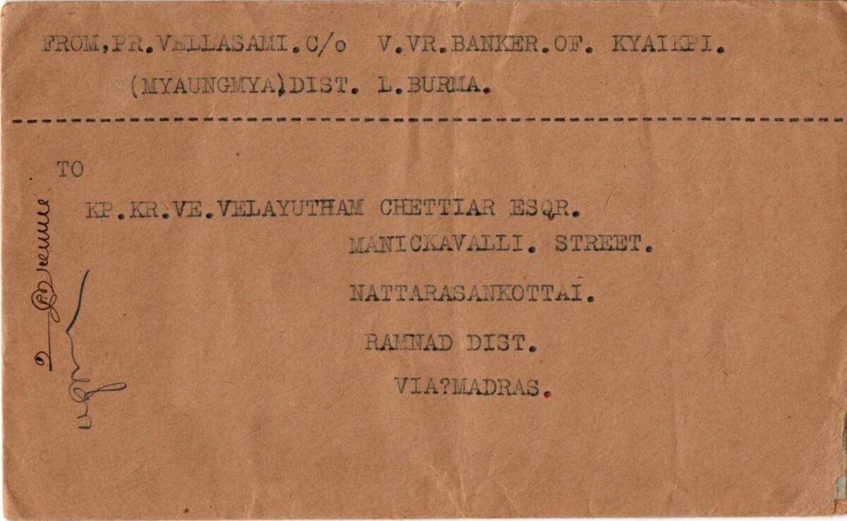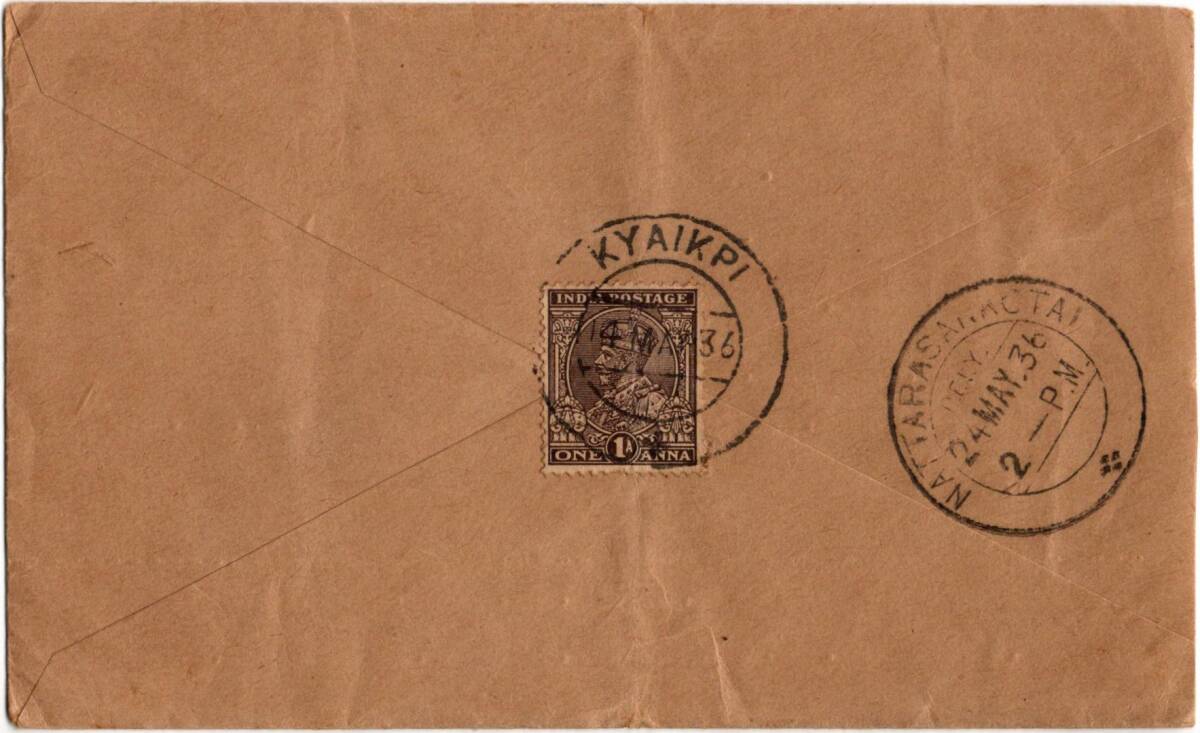 ビルマのチャイクピ局で1936年5月14日に押印されたジョージ5世通常切手1アンナ貼のインド宛封書。