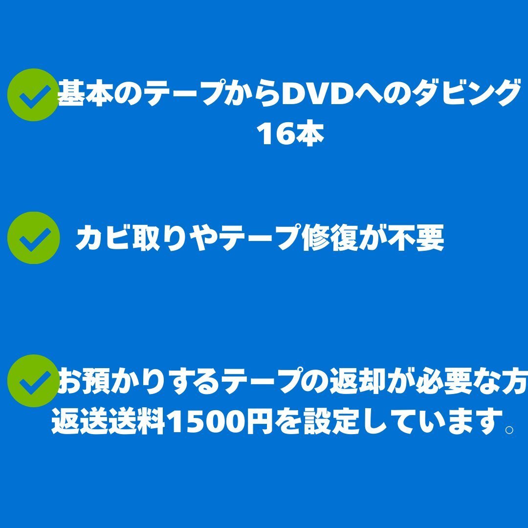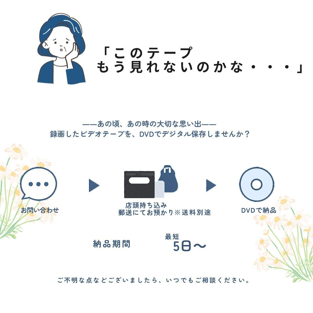 ご用意した商品をご落札いただく一般的なオークションとは異なり、お客様のビデオテープをお預かりすることからお取引が始まります。 ご落札後にお預かりするビデオテープをDVDにダビングしてお届けすることが出品内容となるため、お取引方法が異なりますこと、ご理解のうえご入札をお願いします。 こちらの商品は以下の方専用の商品ページです。 *DVDにダビングしたいビデオテープが16本 *お預かりしたビデオテープの返却が必要な方 (返却送料1.500円※北海道・沖縄・一部離島は2.300円) *テープの修復が不要な方 (カビ取り+テープ切れ修復が必要な方はコチラの商品をご落札後、オプションも一緒にご落札下さい。下記バナーよりご落札できます) ![]() 対応できるテープはVHS/VHS-C/8mmです。 |