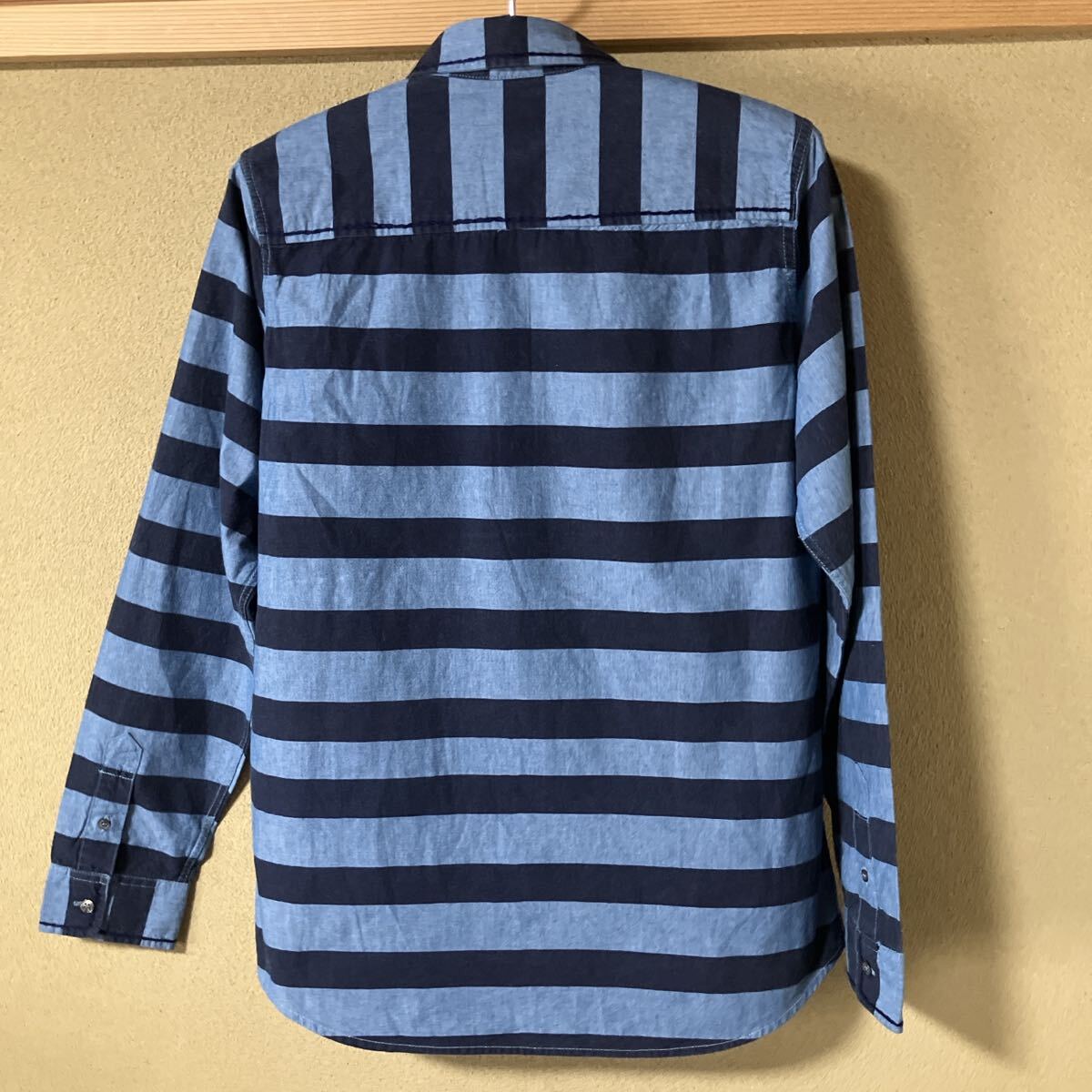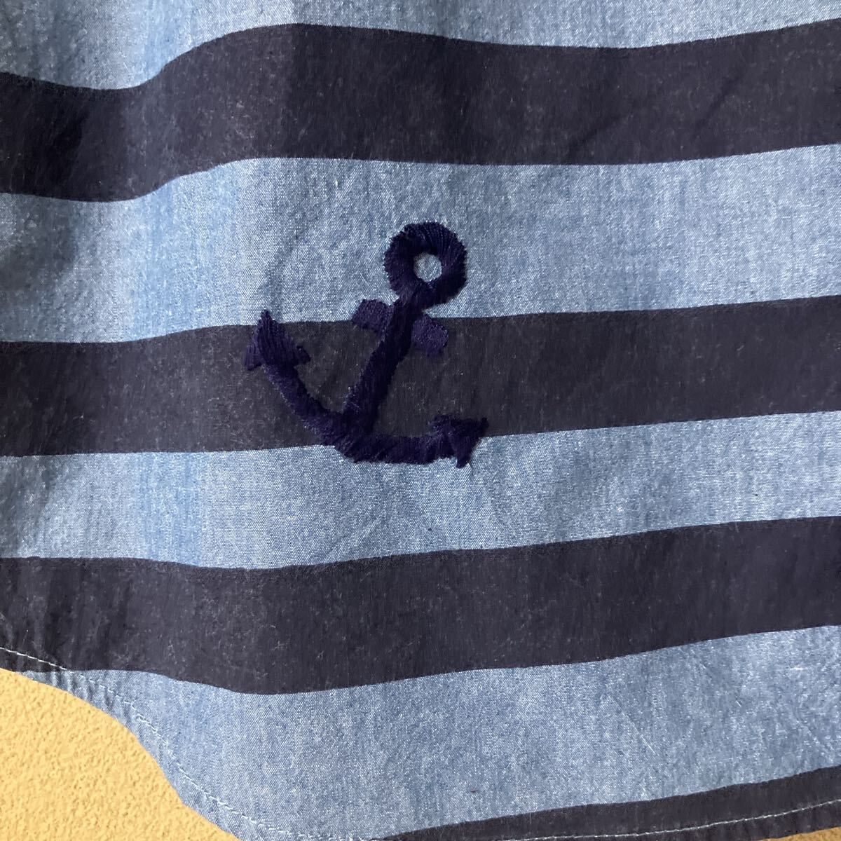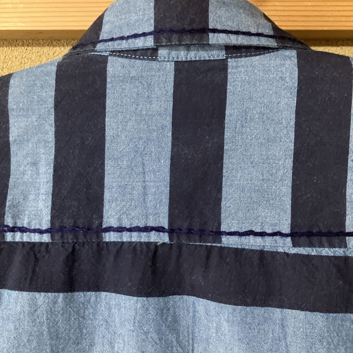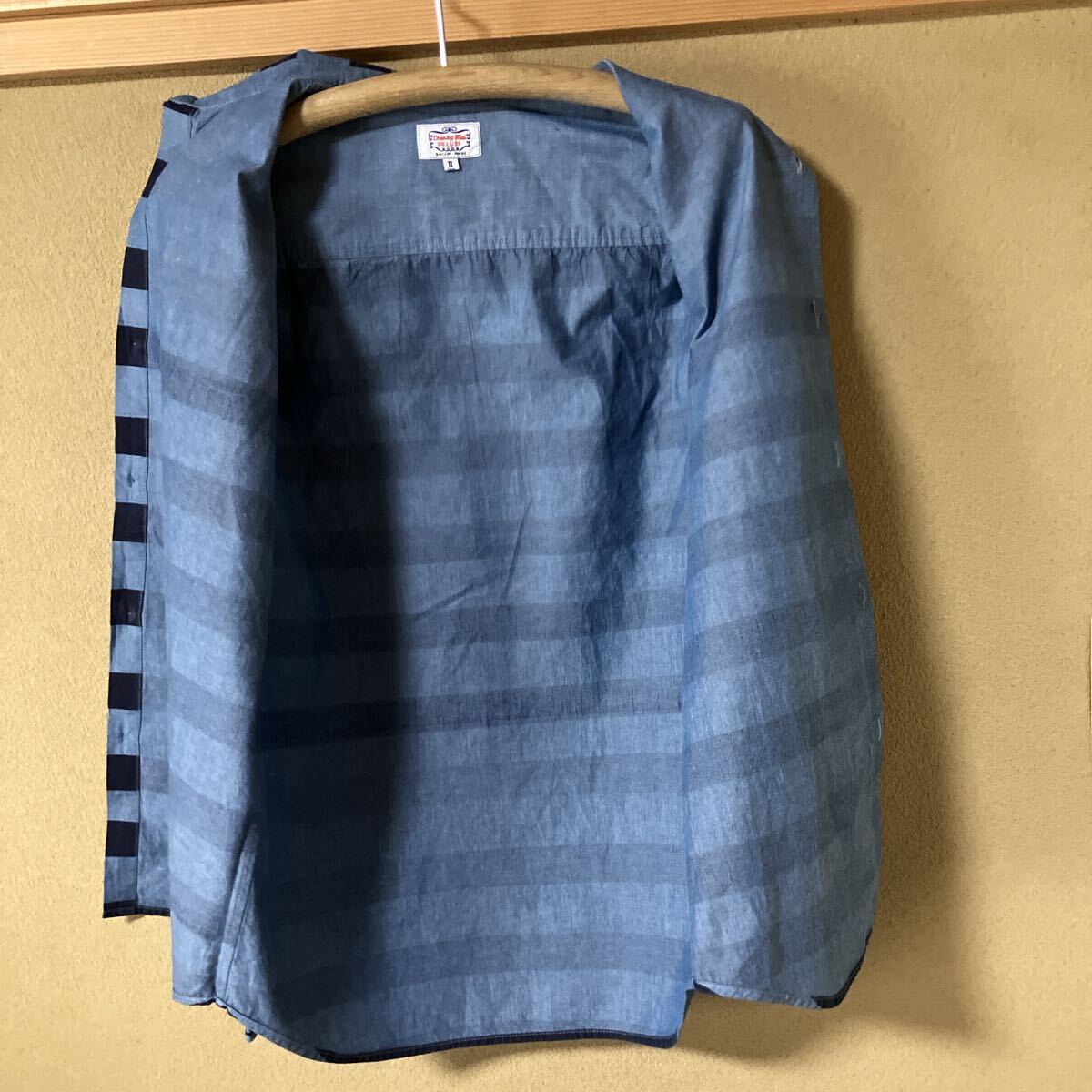 デニム等の同族生地、Indigo色のシャンブレーの生地に藍色のボダーを入れた長袖シャツ,仕上げは前立てに刺し子、襟と袖口カフにステッチにアンカー刺繍が入っています。サイズはMになります。