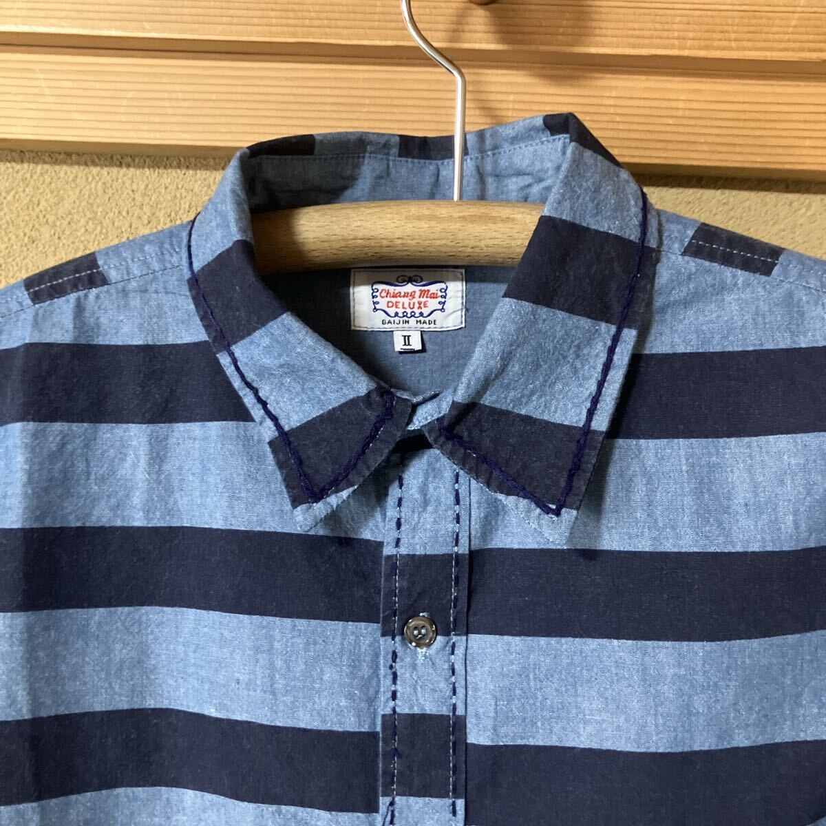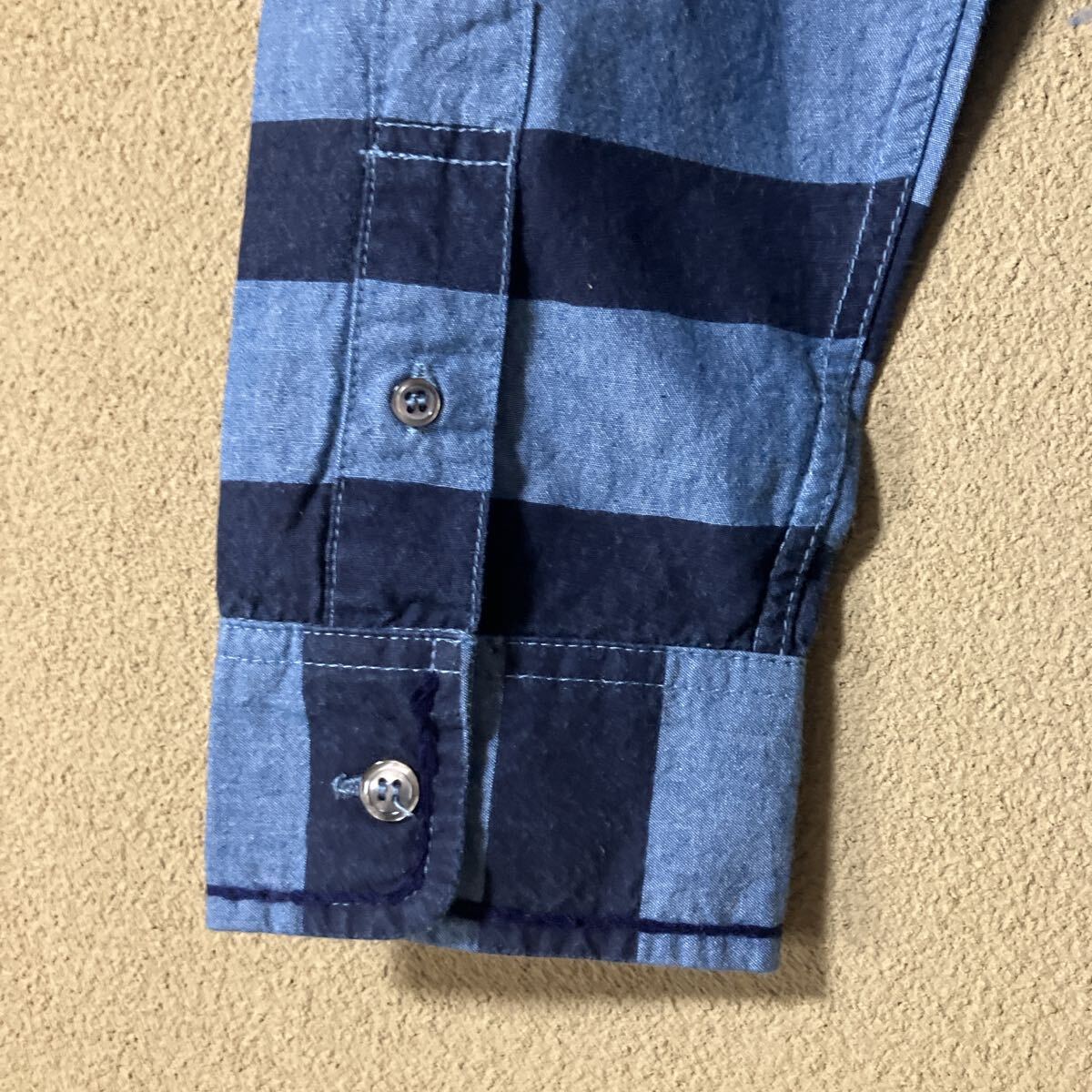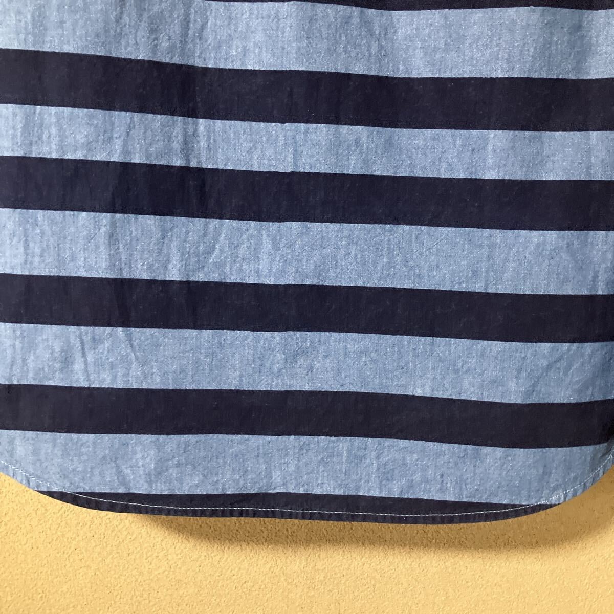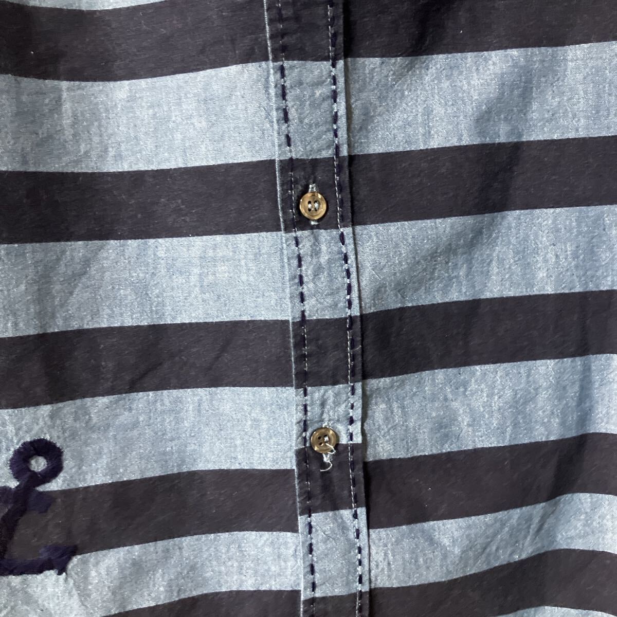 デニム等の同族生地、Indigo色のシャンブレーの生地に藍色のボダーを入れた長袖シャツ,仕上げは前立てに刺し子、襟と袖口カフにステッチにアンカー刺繍が入っています。サイズはMになります。